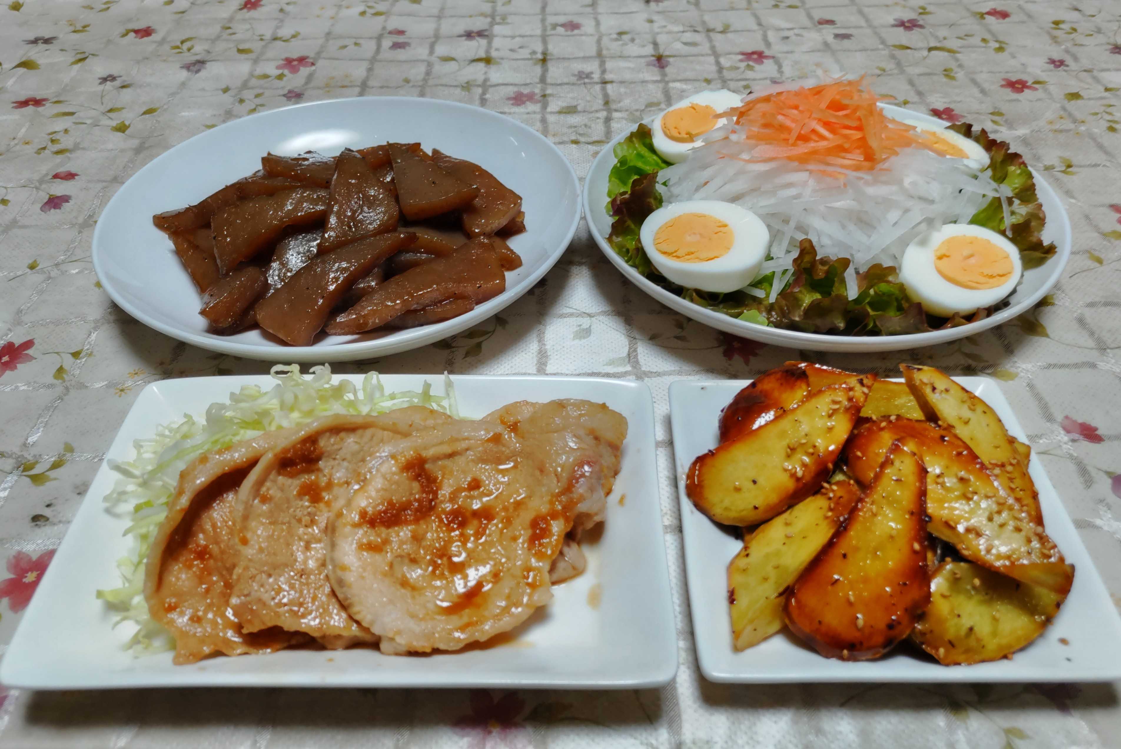 今日のごはん今日のごはんは豚ロース肉の生姜焼き手作りコンニャクの煮物サラダ大学芋豚…