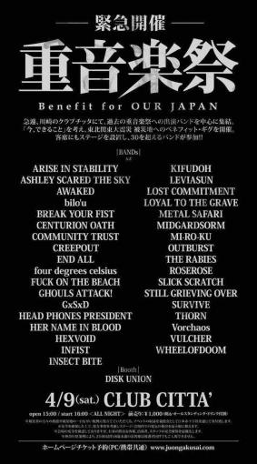 4/9(土)は、東北関東大震災チャリティーイベントとして2週間ほど前に急遽開催が決定した重音楽祭に行ってきました。@クラブチッタ川崎。お仲間さんとジョナサンで待ち合わせして、トップバッターから楽しみました^^ハードコア系のバンドが多かったかな。気合の入ったテコンダーがフロアでぶんぶん暴れまくってる場面が多かったですw今回も掘り出し物がありました。2番目に出たバンドでいきなりツボ。エレクトロニカ?ハードコア系?何かジャンルはわからんがwASHLEY SCARED THE SKY というバンド。コテコテざくざくスラッシュをやってるEND ALLもよかったなー!自然とヘドバンしちゃう。以前、一度観た事あるんだけどARISE IN STABILITYってバンドもやはりすごい。演奏がテクニカルで、他のバンドとは一線を画する雰囲気でしたね。BREAK YOUR FIST って~ハードコア系のバンドには驚いた。一番人気だったんじゃないのかしら。こんなに人いたのー?ってくらいフロアに大勢客が集まってた。そんでもって、私もかな~り好みですわよ~~(*^m^*)マイスペしかし、しかぁ~~~し!METAL SAFARI にはかないませ~~~んまたもやサヨちゃんと最前列で頭振りまくって来ましたwwwVOのInaさんが、見るたびカッコよく、どんどんカリスマ性が出てきてる気がする。METAL SAFARI後はまぁ~、ロッカーの所のベンチでちょいちょい休みつつ、まったり楽しみましたよ。何といっても今回オールナイトなんでね、と、言っても11時頃帰りましたけどwオールはムリよ~、この年でwwwHER NAME IN BLOODも見たかったけど、何しろ出番が夜中の3時ですから(爆)ま、先日観たばかりだからあきらめもつきました^^;節電のため、会場はかなり暗かったですが、アツいイベントで楽しかった!