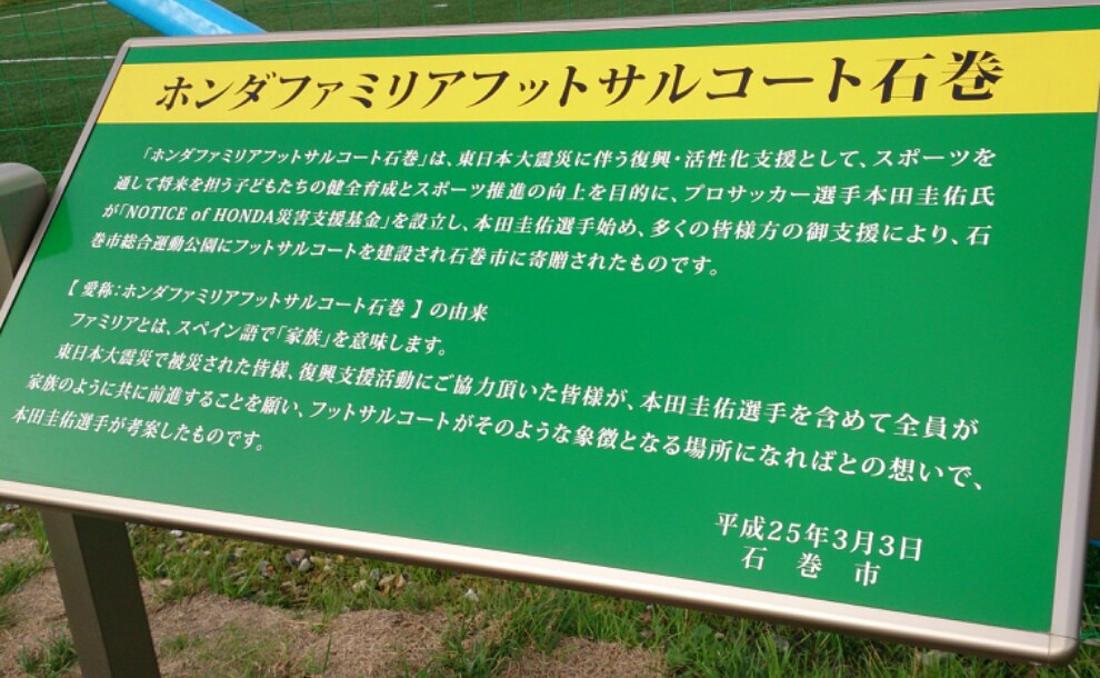 どうも、リニューアル最初の投稿が出張先という訳のわからん事になっている僕です。まぁ、結論から言うと暇なんです(爆いや、暇って言うのは言い過ぎました。何しろ日曜日(7/7)にわざわざこんな所に行って来ましたんでね。出張先が石巻と聞いて何かないかと調べていたら出てきたので行ってみたのです。無駄な行動力の高さに定評のあるウォローでございます(´・ω・`)流石に勝手に入ったらダメかなと思い、チキンな僕は近くの広場でボールを蹴っておりました。でも、正直入ろうと思えば入れたんじゃないかという疑惑(×え?ボール持ってきてたのかって?当たり前じゃないですか、持ってきておりますよ!流石にスパイクは持ってきてないけどトレシューとサルシューも持参してます!遊ぶ気満々で来ておりますけど何か!?(#゚Д゚)すいません、取り乱しました。まぁ、こんな感じですが、元気に毎日を過ごしております。ちなみにそのコートの隣にあった芝のグラウンドも…。7月中には北海道に戻る予定ですが、機会があったらまた来てみたいですね。それはそうと石巻は津波の被害で大変だったと聞きましたが、大分復興は進んでいる模様です。やはり酷かったのは水辺の地域なのか、その辺りは護岸工事や道路の復旧等が未だに続いてます。あと、土砂崩れして片側通行になってしまっている道も見かけました。石巻で実際に仕事をしていてお客さんと話している中でも色々と話を聞く事ができました。「前の家が流されてしまって…」「仮住まいでとりあえずネットを使いたくて…(近いうちに新居に引っ越す)」「申し込んでたんだけど震災の影響で伸びに伸びて…」→これは先行して出張していた人から聞いたおっと、何やら話が大きくそれた気がするぞ…。まぁ、日記を書くと大体こんなもんです。さて、明日…っていうか書いてるうちに日付が変わってしまったので今日ですな。久々の休日なのでゆっくり羽を伸ばさせて頂こうと思いまする。