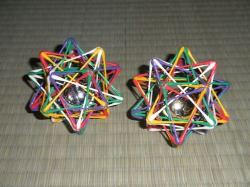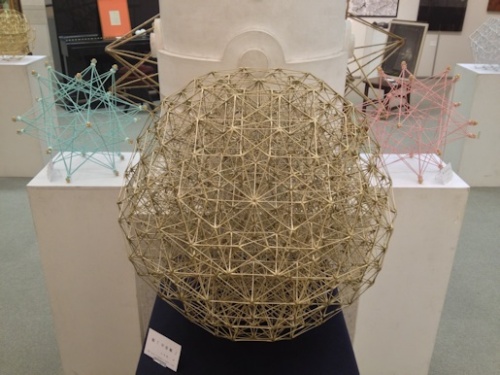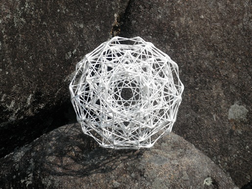 本日の平成25年5月10日(金)は、60年に1度と伝わる出雲大社「平成の大遷宮」において、「本殿遷座祭」が斎行される記念すべき日である。出雲大社といえば「縁結び」で有名だが、今日の画像はその「結び」を象徴する造形を映したものだ。さらに「縁結びの神様」といえば、出雲大社の主祭神「大国主大神」となるわけだが、私なりの「オホクニヌシ」のイメージは「地球」である。この大地を治める国津神の代表たる神名「大国主」が意味するところの本質とは、私たち人類を含めて、生きとし生けるものが生かされている「地球」だと感じる。この造形は、全体として「サッカーボール形状(準正32面体)」となっており、かつて画像の造形よりも一回り大きな同型の立体(準正32面体の複合立体)を手に持ち、合同の正式参拝に出席したことを思い出す。この造形は、幾何学的に最も「球体」に近いことから自ずと「地球」が想起され、また生きとし生けるものが「ひとつ」となった『むすび』の象徴とも認識することができよう。また、全部で60ある頂点の「むすび」で出来ているこの造形は、出雲大社の60年に1度の御遷宮に関連するようにも思えて、本日という良き日に『むすび』と題する造形を公開できたことは有り難き幸せである。【作品の概要】全体としての形状は、「準正32面体」(サッカーボール形状)の複合立体です。その内部構造の構成単位は「五芒星」、そして外部構造の構成単位は「六芒星」となっており、「五芒星」の「火(陽)」の要素と、「六芒星」の「水(陰)」の要素が和合した造形です。つまり、内と外の相反する要素が「ひとつ」に結ばれた「太極」をあらわす造形といえます。
