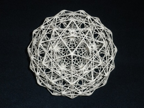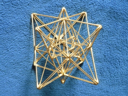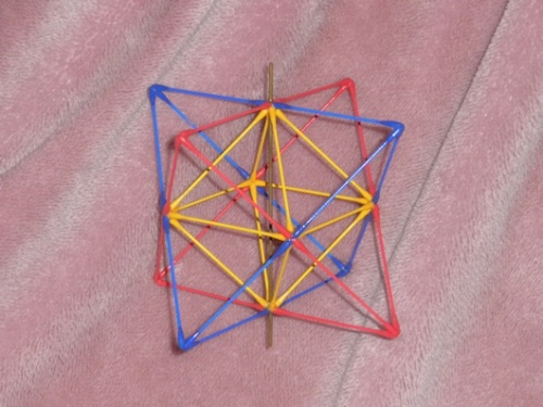 中心の回転軸(金色)を立てて、大きな二つの「正四面体」(青色と赤色)の合体構成により見出せる中央部の共通項「正八面体」を黄色として、その全体構造を「色」の三原色で区別してみた。そこに読み取れたのは、あらゆる物事の根底を支えている普遍的原理たる「火(赤色)」・「水(青色)」・「土(黄色)」、つまり「ひみつ(秘密)」であった。陰陽の「二元(火・水)」を超えた『三元(火・水・土)の仕組み』は、おそらくこの金色の「軸立て」で活きてくるのである。私的には、この形象を見ていると、「カタカムナ」の《八鏡文字》や、「ホツマツタヱ」の《フトマニ図》が観えてくるから不思議である。この造形に連動する「数理」があるのだが、それはまた別の機会にしたい。