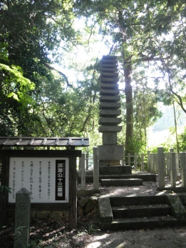 9月26日(木)最後の訪問地は「大化の改新」の発祥地として聞こえた「談山神社」であった。たまたま停めた当社の駐車場から階段を降りて、まず導かれるようにして訪ねたのは、「淡海公(たんかいこう)」を祀ると記された「十三重の石塔」であった。(上の画像)当社の境内からは離れており・・・ずいぶん寂しいところにあるな・・・と思いつつ解説文を読むと、「淡海公十三重塔」の横に「藤原鎌足公の次男 不比等 を祀る」と記してあった。ということは、この「峯の塔」とも呼ばれる十三重塔が、あの権勢を誇った「藤原不比等」を弔う石塔であり、またこの場で初めて不比等が「次男」であることも分かって、私は心底驚いたのを覚えている。この画像は、「談山神社(だんざんじんじゃ)」の境内に鎮座する中心の社殿となる「御本殿」(御祭神 藤原鎌足公・重要文化財)を撮影したものである。参拝を済ませて、拝殿より春日造りの朱塗りに映える御本殿を拝観していると、その妻飾りの上に藤原氏の御紋である「藤紋」を確認することができた。その御紋をよく見ると「上り藤」である。そこで、その「上り藤」の御紋が分かるように、少し拡大して映したものが下の画像である。一般に藤原氏の御紋といえば「下り藤」が主流となるが、藤原氏の大先祖たる鎌足公を祀る当社社紋が「上り藤」とは、これ如何に・・・ということで、この件について社務所で訪ねてみることにした。丁度その時に神主がいらしたので訪ねると・・・「上り藤」にしても「下り藤」にしても、藤原氏をあらわす御紋です。「下り藤」の社紋で有名な神社は、「春日大社」がございます。・・・との返答であった。それ以上のことは聞かなかったが、先ほどの拝殿のところで、社殿創建の経緯を読んでいたこともあり、ここで私なりの「気づき」があった。ここで以下、参考文章として当社の由緒(部分)を転載してみよう。天智天皇8年(669)10月、鎌足公の病が重いと知った天皇は自ら病床を見舞い、後日「大織冠内大臣」という人臣の最高位を授けられ、「藤原」の姓を与えました。藤原氏は、ここから始まります。鎌足公の没後、御墓は摂津国阿威山(現在の大阪府高槻市)に造られましたが、白鳳7年(678)唐より帰国した長男・定慧和尚が、鎌足公の遺骨の一部を多武峯山頂に改葬し、十三重塔と講堂を建立して妙楽寺と称しました。さらに、大宝元年(701)方三丈の神殿を建て、鎌足公の御神像を安置しました。これが談山神社の始まりです。(以上、転載分)その「気づき」とは、以上の由緒や上記の内容から類推して、この「上り藤」と「下り藤」の区別は、鎌足公の「長男」の定慧和尚と「次男」の不比等を象徴しているのではないかということだ。つまり、この大和多武峯「談山神社」は、長男の定慧和尚の主導による創建なので社紋は「上り藤」、そして神主の返答にもあった「春日大社」は、次男の不比等が創建したので社紋は「下り藤」と、そのような観方が成り立つと感じたわけである。・・・なるほど・・・と自分なりに腑に落ちた私は次に、父・藤原鎌足の追福のために、長男の定慧と次男の不比等によって西暦678年に建立された「十三重塔」(重要文化財)の近くに行き、そこで世界唯一と詠われる檜皮葺きの木造十三重塔(高さ約17m)を撮影したものが下の画像である。その朱色を基調とするシンメトリックな美しさは、これまでの「塔」のイメージを超えるものであり、圧倒的な重厚感のただよう建築様式だった。まさしく談山神社のシンボル的な存在である。そして、中大兄皇子(後の天智天皇)と中臣鎌子(後の藤原鎌足)が、藤の花の盛りの頃に、当社本殿の裏山で極秘の談合をされたと伝わる「大化の改新・談合の地」へと向かった。