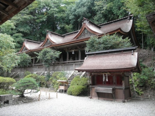 「金峯神社」に参拝の後は、「吉野水分神社」にお参りした。朱塗りの美しい鳥居をくぐり、少し階段を登って神殿方面へ向かい、その境内で撮影したものが「上の画像」である。この社殿は「三社一棟造」といわれ、豊臣秀頼により再建されたもので、国の重要文化財に指定されている。当神社の主祭神「天水分命」は、もともと吉野山の主峰で吉野川の水源にあたる「青根ヶ峰」に、「吉野水分峯神(水神)」として祀られていたと伝わる。この古くから崇敬を受けた青根ヶ峰の「水神」を、後の時代になって山頂付近に金峯神社(奥千本)・山腹にこの吉野水分神社(上千本)・山麓に勝手神社(中千本)と、三社に分けて建てられたとのことだ。そして「下の画像」は、上記三社の一社である「勝手神社」の、そのすぐ近くに鎮座する「吉水神社」の境内にて、社殿(右側)とその左奥の書院を撮影したものである。この「吉水神社」は、南朝の「後醍醐天皇」を主祭神とする神社で、社伝によると元々は「役の行者」の休息の庵室として創立され、金峯山寺の僧坊・吉水院であったが、明治になって廃寺となり、「吉水神社」と改称したとのことである。ここで以下、この「吉水神社」について書かれたものを、抜粋して紹介しよう。当社は「吉野の歴史」を代表する殿堂で、文治元年(1185)源義経が兄頼朝の迫害を逃れて愛妾の静御前、弁慶らと共にここに息をひそめ、後世にその悲恋物語を伝えている。また、延元元年(1336)後醍醐天皇が京の花山院を逃れて、吉水院宗信の援護のもとに当社を行宮とされ、血涙の歴史が記された南朝の大舞台でもある。降っては文禄三年(1594)太閤秀吉が当社を本陣として大花見の盛宴を催し、天下にその権勢を示したのは有名だ。したがって当社に所蔵する宝物はすこぶる多く、百二十数点を展覧しており、重要文化財の宝庫といわれている。この神社を有名にしたのは、その由緒もさることながら、実は現存する「書院」であって、わが国の書院建築史の第一頁に位する本格派の建物で、初期書院造の代表的傑作とされている。今なお書院内には「義経潜居の間」「弁慶思案の間」「豊太閤花見の間」等が残されている。さて、実はこの「吉水神社」に近い「勝手神社」の社殿は、近年の火災で消失したままで、未だ再建されていないとのことで、「勝手神社」の御神体は「吉水神社」に奉安されているとのことだ。その経緯は、「勝手神社」の存在も含めて、帰宅後に知ることとなった。後日に調べると、この吉野山の入口ということで「山口神社」とも呼ばれている「勝手神社」の境内では、歴史的な転換期において立役者を含む数々の大舞台が演じられてきたとのことである。そのなかで私なりに印象に残った伝承は、古くより宮中にて「新嘗祭」や「大嘗祭」など公式の晩餐会で披露される「五節舞」(ごせちのまい)は、ここ「勝手神社」が発祥の地だったということだ。「勝手神社」の社史には、672(弘文二年) 大海人皇子(後の天武天皇) 吉野勝手神社に祈ると天女現れ吉兆あり。 とあり、当時は「大海人皇子」が吉野に身を引いている際、勝手の宮(勝手神社)で箏を弾いていると、袖振山から乙女が五人舞い降りてきて、「 乙女ども 乙女さびすも 唐玉を 袂に巻きて 乙女さびすも 」と歌い舞ったという故事が、「大歌」(おおうた)の起源といわれている。そして、この大歌を伴奏として舞う舞を「五節舞」といい、五人の舞姫によって舞われる、現在ある唯一つの女性のみの舞ということである。(ただし現在では、例年の新嘗祭では斎行されず、大嘗祭の後の「大饗」で行われるのみとのことだ。)・・・「続日本紀」の天平十五年(743)には、聖武天皇が元正上皇のために阿倍内親王(孝謙天皇)に「五節舞」を舞わせた際に、天皇が上皇に対して『天武天皇が天下統治のために「礼(天地の秩序)」と「楽(天地の和)」を整備するために「五節舞」を考え出された』と述べている。・・・