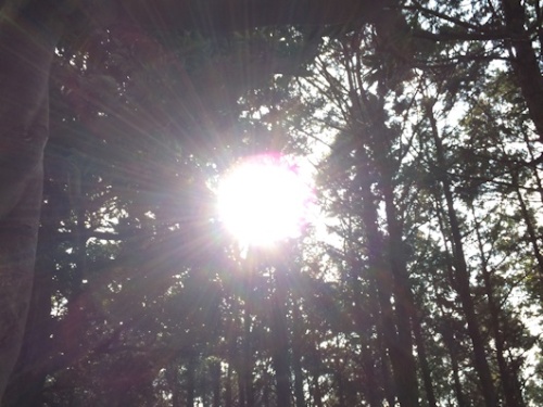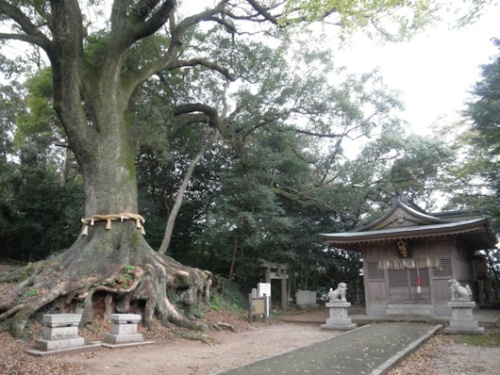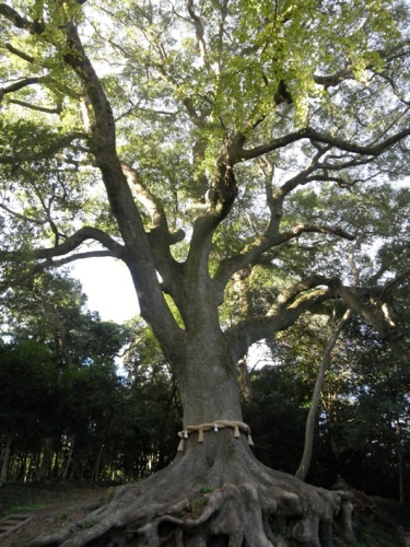 そして11月25日の午後1時頃、福岡県福津市に鎮座する「宮地嶽神社」に到着した。当神社への参拝は二度目だと思うが、もう十数年ぶりに参拝したということもあり、これほど立派な社殿も含めて殆ど記憶に無いのも、自分でも不思議であった。初めて参拝した当時は、ただただ知人の案内で、境内のかなり後方にある古墳を、被葬者が誰とも知らずにお参りしたのを覚えていた。御神前にて参拝の後、その「宮地嶽古墳」を目指して歩くうちに、山名に「嶽」が入っていたせいか、神体山の頂上が気になり始め、足がスイスイと山上に向かうに任せていると、いつの間にか宮地嶽(標高約180m)の山頂に到着した。そこで上の画像は、その山頂より展望の開けた玄界灘を望む西北西の方位を撮影したものである。そして下の画像は、その山頂にある御神木と、その向こうに僅かに見える祠を撮影したものだ。その山頂の祠の近くには、由緒が書かれた立て看板があり、その内容を以下に記しておこう。◎宮地嶽神社 古宮の由緒今を去る千六百年余り前 息長足比売命(神功皇后)は 此の地 宮地嶽山頂において 八百万の神々に 「 天命を奉じて彼の地へ渡らん 希わくば開運を垂れ給へ 」と祈願され大陸へ出帆されました皇后の余りにも有名不可思議なご偉業を称え ここに御祭神として祀り 宮地嶽神社が創建されましたその山頂では轟々と、強い風に杉林が大きく揺らぎ、その恐れ多い歓迎ぶりに、自らの腹帯を締め直して下山、その麓にある「宮地嶽古墳」を訪れた。現在この古墳の横穴式石室は、当神社奥の宮「不動神社」の神殿となっており、参拝の際に石室の奥が拝めるようになっていた。その長さが約22mという石室の規模は、奈良の石舞台古墳の約20mをしのぎ、発掘された金の鐙(あぶみ)・冠(かんむり)・馬具類・大太刀等数多くの埋蔵物の20点が、国宝の指定を受けている。この「宮地嶽古墳」の被葬者は現在、「天武天皇」の第一皇子である高市皇子(たけちのみこ)を産んだ尼子娘(あまこいらつめ)の父である「胸形君 徳善(むなかたのきみ とくぜん)」とする説が有力とされている。ところが、当古墳の被葬者について神社側は、「決して宗像徳善ではない。現在でもここでは磐井の末裔を祭祀している」と弁明されているとのことで、意外にも「磐井」の末裔を当神社で祭祀してきたことを知ったのは、実に本日の12月2日であった。この「磐井」とは、歴史探訪(4)でも記したが、AD527年に起きたとされる「磐井の乱」の首謀者にして、「筑紫君 磐井(つくしのきみ いわい)」の呼び名が通説である。実は翌26日は、その「筑紫君 磐井」が築造した「岩戸山古墳」に訪れることになるのだが、この「宮地嶽神社」の参拝を終えた時点では、当日中に帰る予定だったこともあり、まさか鞍手の「熱田神社」から続く「磐井」に関連する展開になろうとは思いも寄らなかった。そうこうするうちに午後三時となったので、近辺の新しい温泉施設に寄ってから帰宅しようと思って、フト近くのホテルにもう一泊しようかと考えたその時・・・突然、雲間から太陽の閃光がピカー!・・・これは《そうすべし!》との合図と判断して、素直に宿泊することにした次第である。つづく