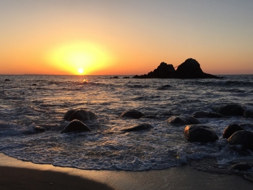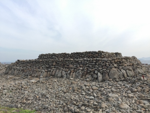 年に2回の2月20日頃と10月20日頃、宮地嶽神社の神前より西方の海に落ち行く夕陽は、参道の先に真っ直ぐ沈み、神社と海岸、そして「相島(あいのしま・あいしま)」が一直線で結ばれる。その年に2回の日取りに、当社では「夕陽の祭」が開催され・・・ご祖先様が坐(マ)します彼の世(あのよ)と この世が一直線に繋がる日・・・として大切にされてきたとのことだ。その祭日に神社と一直線に結ばれる「相島」は、福岡県糟屋郡新宮町の島(有人島)である。新宮漁港から北西約7.5キロメートル、町営渡船でわずか17分の玄界灘の海上に浮かぶ。島の形状は三日月型で東西に細長く、南に面して入り江になっており、夏季の台風接近や冬季の北西寄りの季節風等により玄界灘が荒れている場合も、対岸の九州本土に比べて船の出入りが可能であることが多く、昔から急な荒天の場合の船の避難場所となっていたそうだ。今回が初めてとなる「相島」に渡って訪れた東方の長井浜という場所に、国指定史跡の「相島積石塚群」があった。この積石塚は4世紀後半~6世紀のものとされ、約500m×50mの範囲に250基以上の積石塚群があり、円墳や方墳が中心だが、前方後方墳もある。冒頭の画像は、一帯の積石塚群の中央部にあって最大の「前方後方墳(相島大塚・120号墳)」を映したものだ。そして次の画像は、その解説版を撮影したものである。ある研究者によると、この「相島積石塚群」は海人族(安曇族)との関係がうかがえる貴重な遺跡で、宮地嶽神社の参道がピタリとこの古墳群に向けられており、神社境内地と古墳群は同時期に位置調整が行われたことがわかるそうである。・・・とのことから、冒頭に記した「夕陽の祭」の・・・ご祖先様が坐(マ)します彼の世(あのよ)・・・とは、まさしく神社の参道が指し示す先の「相島積石塚群」を意味していたことを、現地を訪れてみて実感したところである。平成13年に国指定史跡となった「相島積石塚群」の地域内は、現在は見学路が設けられ散策ができるようになっている。下の画像は、積石塚群で最大の前方後方墳の上から、画像では確認できないが対岸の中央部にある参道の、その先の高台に鎮座する「宮地嶽神社」の方面を撮影したものである。さてそこで、なぜ年に2回(2月20日頃・10月20日頃)の沈む夕日が示す方向を、神社の参道として定着させるほど重要視したのか・・・次回の日記ではその背景について考察してみたい。