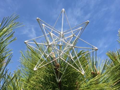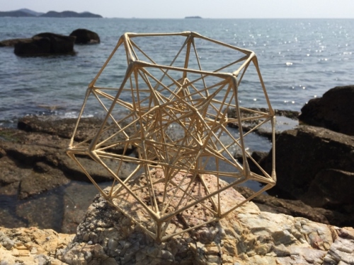 2016年は当たり年とも言うべきか、一月初旬から数点の新作が生まれているのだが、自身のホームページ(下記に紹介)に公開できた作品は、今年になって今回が二作目となる。そこで上の画像は、今回が初めての公開となる新作『 入れ子12面体 』の晴れ姿を映したものだ。上に・・・今回が初めての公開・・・と記したのは、実はこの造形は十数年前に創作していたためで、この3月23日という春分に近い「満月」の月日に、満を持してこの『 入れ子12面体 』が公開できたことを嬉しく感じている。さて、作品の名称に「入れ子」を加えているのは、この造形が全体として、大小二つの「正12面体」の軸線構成が合体した二重の構造体になっているからである。つまり、内側にある「小さな12面体」の外側に、それを取り巻くように「大きな12面体」を組み上げた構成となっているので、例えば内から外へと拡大するマクロの方向、あるいは外から内へと縮小するミクロの方向・・・などと、イメージングを楽しみながら「入れ子」の関係にある大と小の12面体の相互関係を様々に類推することができる。おそらく想像力(創造力)の豊かな方は、この作品を通して変幻自在の想いを巡らせることができるだろう。
