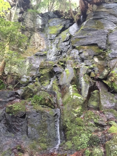求菩堤山の広い山頂部が、かなりの規模となる巨石群で形成されていたことに感動の余韻に浸りながら、次は少し降った南側の八合目を取り巻く岩壁に寄り添うように歩き、往時は山伏の修験の場とされた「求菩提五窟」と称される五つの岩窟を巡っていくことに。まず冒頭の画像は、岩窟を巡る最初の頃に出会った、近隣河川の源流に数えられるであろう大岩壁の天辺から流れ落ちる微かな水流を映したものだ。それぞれの岩窟には立て看板があり解説も記されているのだが、ただただ次々に現れる巨大な岩壁の数々に圧倒されつつ移動していったのを憶えている。中でも上の画像の「普賢窟」(直下に祠あり)は、そのふくよかな岩肌の女性性に感銘を受け、下方の岩の割れ目に耳を近づけると、その奥に流れる水のたおやかな音が聞こえてきたので、とりわけ強く印象に残っている。そして、この岩窟の割れ目から発掘されたという銅版法華経と経箱は「国宝」に指定されており、それは山麓の「求菩提資料館⇒ リンク」に数々の修験道における信仰の証とともに常設展示してあるのも素晴らしい。以前この資料館を訪れた際に、この国宝(レプリカ)を拝見したのだが、今まで見たことのない魅力に溢れる文化財だったことを憶えている。それはそれとして、実はこの普賢窟(胎蔵窟)は「求菩提五窟」のなかで最重要の霊窟とされ、その普賢窟に祀られた「岩瀧宮」の祭神に関して、明治期初頭の求菩提山に伝わる史料には「岩瀧宮 瀬織津姫命」と明記してあるそうだ。祭神の「瀬織津姫命(セオリツヒメ)」は宮号に「岩瀧」とあるように滝の神でもあり、つまり求菩提山信仰の内部では、普賢窟の霊神・岩瀧大明神が、滝神・水霊神を本質とする「瀬織津姫命」と伝えられていたということである。上の二つの画像は、本日のこれまでの画像のように、あまりに巨大な岩壁のため写真の枠に収まらないので、それぞれ天を仰ぐようにして映したものである。そして下の画像は、最後に訪れた「禊場(みそぎば)」を撮影したものだ。求菩堤山の修験者は修行を終えて帰るとき、この冷泉で身を清めたということである。ところで、古代より「求菩堤山(標高782m)」は、隣り合う「犬ヶ岳(標高1130m)」とともに、一対の霊峰として栄えてきた経緯があるとのこと。ここで興味深いことは、この二つの山の関係が「犬ヶ岳が神の山で、求菩提山がそれを拝した山であろう」と古文献に記され、求菩提山は犬ヶ岳の遙拝山、つまり犬ヶ岳は求菩提山の奥宮的聖山とみなされているところだ。実は求菩提山の南方に聳える犬ヶ岳には、封印された「深秘の尊体」が存在し、それゆえに犬ヶ岳が絶対的な「神の山」とされ、山上に踏み込むことが許されず、求菩提山より遙拝するものとされてきたらしいのだ。その「深秘の尊体」と深く関わる霊神の名が、上に記したように求菩提山の普賢窟に祀られた「瀬織津姫(セオリツヒメ)」である。それでは、犬ヶ岳の「深秘の尊体」とは・・・となるのだが、ここで鍵となるのが求菩提山は国玉神社の境外社「豊照神社(明治以前は毘沙門堂)」であろう。(上の画像は、国玉神社の北方に鎮座する豊照神社を撮影したものだ。)この豊照神社の祭神は、物部氏の祖「饒速日命(ニギハヤヒ)」とされている。そこで思い出したのは、記紀以前の歴史書『ホツマツタヱ』によると、「饒速日命(ニギハヤヒ)」と「瀬織津姫命(セオリツヒメ)」が、夫婦神として記述されていることであった。 それはもしかすると、「犬ヶ岳」と「求菩提山」の一対の関係をあらわしているのかもしれない・・・。※関連記事⇒ リンク