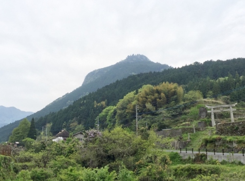 先月の4月下旬、豊前国は修験道の中心として名高い「求菩提山(標高782m)」(くぼてさん・福岡県豊前市)を初めて登拝した。冒頭の画像は、その求菩提山の特異な山容を遠望したものである。求菩提山は古くより豊前国の中心と位置付けられ、多くの山伏(修験者)たちが山内に住んで厳しい修行に挑み、英彦山(ひこさん)と共に北部九州修験道の中心を担ってきたそうだ。※英彦山に纏わる関連記事⇒ リンクこの山の信仰の歴史は古墳時代にまで遡ると考えられ、近世の求菩提山文書によると、継体天皇二十年(526)の猛覚魔ト仙による開山、大宝四年(704)の役行者の入山、養老四年(720)の行善による求菩提山護国寺の建立などを伝えている。しかし、明治元年(1868)の神仏分離令により、求菩提山護国寺は国玉神社と改称され、さらには明治五年(1872)の修験道廃止令によって、求菩提修験道は終焉の時を迎えることになったそうである。まずは山の7合目あたりに相当する、座主坊園地の駐車場(山頂に一番近く綺麗なトイレもある)に車を停めて登り始めた。苔むした緩やかな石段が続き、途中の岩屋坊跡や安浄寺跡などの数々の旧跡を経て、山上に鎮座する国玉神社の立派な石鳥居を映したのが上の画像である。この上の画像は、国玉神社の中宮を経て、鬼が一夜で築いたと言われる「鬼ノ鐙(おにのあぶみ)」の入口辺りで映したものだ。かなりの急坂に850段もの石段が続き、一見すると今にも崩れそうな雰囲気なのだが、長年の風雨や修験者(登山者)の踏み締めに耐え抜いた頑丈な石段であった。ふうふう息を吐きながら、いよいよ山頂へ・・・。上の画像は、その山頂部に鎮座する国玉神社の上宮を、これに向かう下方の石段から映したものである。次の画像は、上宮の左横にあった山頂を示す木標を撮影したものだ。この国玉神社(上宮)は、まさしく求菩提山の山頂に建立されていた。そして、神社の裏手に廻って驚いたのは、上の写真のように累々と巨石が積み重なるように広がり、また繁茂する巨樹と共に山頂部を形成していたことである。この磐座群のことは事前に承知していなかっただけに、感動も一入であった。また下の画像は、その山頂部の巨石群の中で、最も異彩を放ち貫禄のある磐座を写したものである。特にこの磐座は次回の日記で述べることになる、求菩堤山の南方に聳える「犬ヶ岳」の山頂方面を示しているかのようであった。最後の下の画像は、この度の山上を巡った「求菩堤山・周回コース」が描かれた道標を映したものだ。画像の地図では(1)の位置が駐車場で、そこから右回りに黄色で示された山道を(11)~(19)まで廻って一周したということになる。