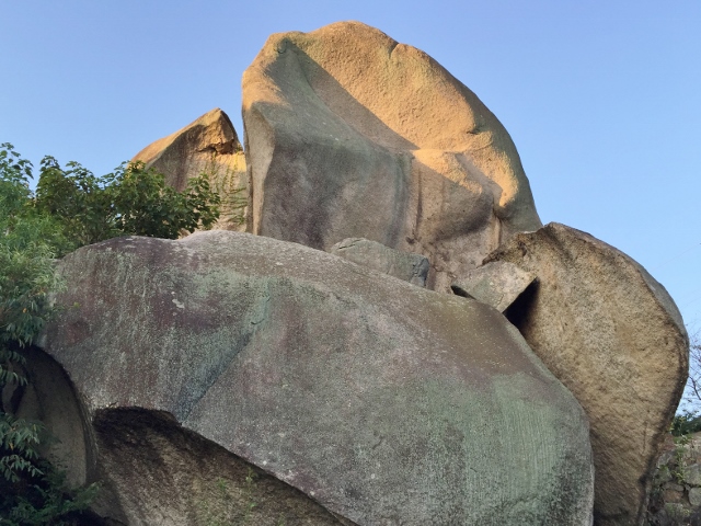 「出雲行脚の後日編」として、「秋の南北軸」の中央の位置づけとなる愛媛県の「大三島」に渡り、伊予国一宮「大山祇神社」の真祭神を追いかけながら、上・中・下の三編を書き上げた翌日、その記述内容の信憑性を後押ししてくれるような、以下に紹介するサイトの記事を知ることになった。※関連記事・・・東大寺(盧遮那仏)と宇佐神宮(比売大神)の神仏習合の意味この文書内容で特に注目したのは、筆者は「東大寺の盧舎那仏」を「ニギハヤヒ」、そして「宇佐神宮の比売大神」を「セオリツヒメ」と認識されている点で、この捉え方は私の記事「出雲行脚の後日編(下)」の「伊勢神宮(内宮)」の真祭神を「ニギハヤヒ」、そして「大山祇神社」の真祭神を「セオリツヒメ」とする観方と、相通じるものがあると感じたところである。つまり、初発の「藤原政権」たる持統天皇と藤原不比等が推し進めようとした、言わば東の「伊勢神宮(主祭神 天照大神)」と西の「大山祇神社(主祭神 大山積神)」の東西・祭祀体制を、「反藤原」で不比等の孫である聖武天皇が、東の「東大寺」と西の「宇佐神宮」の東西・祭祀体制によって見事に巻き返したと、私にはそのように読めたわけだ。加えて私自身、2013年の「春」と「秋」の二季に分けて、まるで「聖武天皇」の治績を追いかけるかのように列島各地を行脚した経緯(以下の関連記事)があり、このサイトを知り得たことは我が意を得たりの心境となった次第。☆関連記事・・・「春」の旅日記(1)~(25)☆関連記事・・・「秋」の旅日記(1)~(50)さて、この上下二枚の画像は、この9月に入り《「岩屋山巨石群」の探訪 》シリーズで取り上げた巨石群の中でも、シンボリックな二つの巨石を撮影したものである。この二つの巨石の解説を引用すると、古代陰陽思想に基づいて巨石群が配置されたとすれば、上の画像の巨石(約8.6m)が男性原理をあらわす「陽石」で、下の画像の割れ目のある巨石が女性原理をあらわす「陰石」と解釈でき、双方の巨石で「陰陽石」と考えられるそうだ。実はこの「岩屋山巨石群」との出会いは、大三島の帰りに高速を走っていた車から、たまたま山頂部の「巨石群」が確認できたので寄ってたわけだが、それが連載記事にも書いたように、これほど心躍る散策になろうとは思いも寄らなかった。そこで巨石群といえば、当日記で何度も取り上げてきたように、岐阜県下呂市の「金山巨石群」が有名だ。個人的に最も崇敬する磐座なのだが、この度この巨石群を研究調査したガイドブックが出版された。既に手元にあるのだが、全国各地にある巨石(磐座)を研究する上でも、とても参考になる良著である。※書籍紹介・・・『金山巨石群の「縄文」太陽観測ガイド』 小林由来 徳田紫穂 〔著〕上に紹介した書籍はアマゾンで購入できるので、興味や関心のある方は如何でしょう。ところで後日になって、ある大山祇神社に纏わる記事を読んでいると、当社の境内に「神池」があり、この池には「大蛇(龍)」が住んでいて、その大蛇を三つに切ったところ、尾が備後国に飛んで「尾道」の地名になったという伝説があることを知った。蛇はその尾に最も力が宿ると聞くが、今回の旅路の最後に尾道界隈で最も「神氣」が宿る聖地と思しき「岩屋山」を、大山祇神社の「神池」を初めて見た後に訪ねることになったのも、やはり「大いなるもの」の差配だったのではないかと感じはじめた今日この頃である。