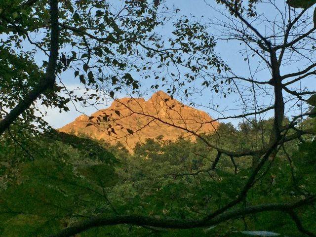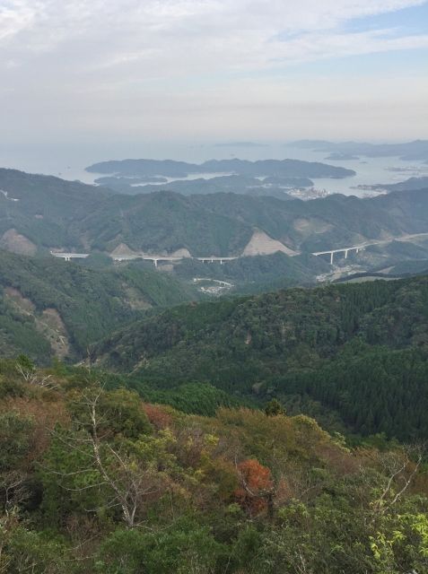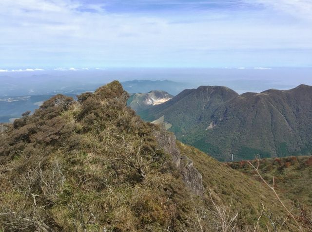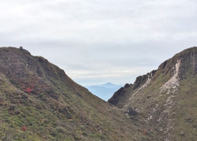 気の抜けない複雑な岩場の連続のなかで、ちょっと一息つけた展望が上の画像である。向かって左の高嶺が東峰、右の高嶺が西峰、そして二峰の狭間の遠方に見える秀麗な山も、山名は分からないが実に印象的だ。これまで歩いてきた道程のなかでも一番の難関だった岩尾根を、振り返って映した画像が上である。自分でもよくクリアーできたと思うほど、尖った鉾のような奇岩が連なる厳しい岩場であった。お鉢巡りも後半となり、西峰から続く起伏の激しい稜線コースを映した画像が上である。そして、西峰を越えた遠方に見えるのは、北部九州の山岳修験における総本山たる英彦山や、続く犬ヶ岳を含む山並みだ。その右側には同じく山岳修験に纏わる安心院の鹿嵐山(かならせやま・雄岳と雌岳からなる双耳峰)や中津の八面山を確認することができる。上の画像はお鉢巡りの終盤、剣ヶ峰付近の見晴らしの良い高台より、東方の鶴見岳山系を越えて四国方面を撮影したものだ。画像では分かりづらいかもしれないが、遠方の画像中央部に微かに浮かんで見える山並みの左端が、石鎚山(標高1,982m)である。由布岳登山の最後に、西日本最高峰の石鎚山を遠望できた私は、胸の高鳴りを感じつつ下山を開始した。下山を始めて難所の岩場をくぐり抜けたところで振り返ると、そこには素敵な秋化粧の紅葉が華やいでいた。そして緩やかな山道になったところで一休み。リュックに入れていた新しい靴と交換のため、それまで履いていた靴に目をやると、なんと!一方の靴先が破れているではないか・・・。もう少しで履けない状態になるほどの惨状に度肝を抜かれ、西峰登山を途中でリタイアした男性の・・・今日は登山靴を履いていないし・・・という言葉が思い出された。やはり厳しい岩壁のある登山は、念には念を入れた周到な準備が必要だと、改めて実感したところである。それからは足取りも軽く、無事に東登山口に到着。たいした疲れも感じなかったので、そのまま帰途に着くことに・・・。そして、登山前日に宿泊した安心院(あじむ)を経由して帰ろうと車を走らせていると、突然目に飛び込んできた景色が下の画像である。もしかして・・・ということでナビで確認すると、やはり「由布岳」であった。つまりこの画像は、「大崩(おおがれ)」(山岳中央の色の薄い部分)という北側の谷が見える由布岳を、北北東方面から映したものとなる。調べてみると今年4月の熊本地震では、この「大崩」にあった岩壁が大規模崩落したとのことだ。しかし、いわゆる「創造的破壊」という観点では、山崩れも造山活動の新陳代謝という捉え方ができる。いよいよ「由布岳」を離れる最後の締め括りに、その脱皮的革新を経た美しき山肌と山容で、「豊後富士」は私を魅了してくれたというわけである。振り返れば今回の登山は、「山口と九州を貫く南北軸」の軸線上に存在する「由布岳」を体感しておきたいという、私なりの長年の想いから実現した。◎関連記事・・・由布岳(豊後富士)を展望しつつ・・・その念願の由布岳登山を終えて帰路に着き、上記南北軸の「中央」に座す象徴的山岳は・・・やはり「由布岳」である・・・との実感を深めつつ、九州を後にするのであった。