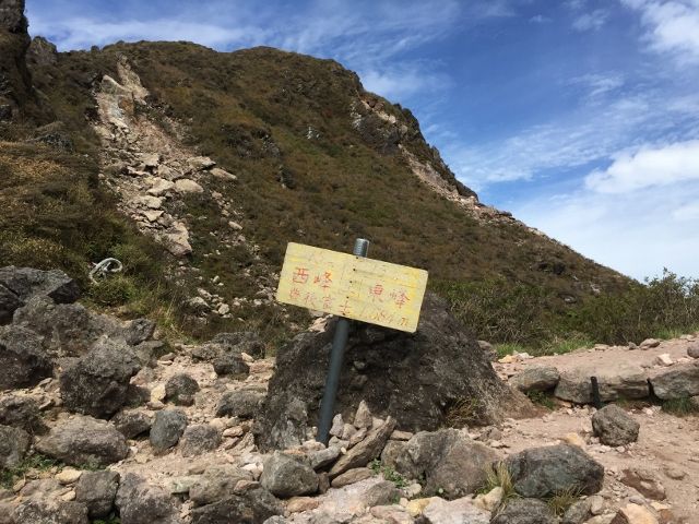 由布岳の九合目あたりから南方の雲海に浮かぶ峰々・・・実に神々しい風景である。この方面の景色の美しさに、何度足を止めて見入ったことであろう。今でも鮮やかに脳裏に焼き付いている。そして山道の前方に目をやると、由布岳東峰に至る最後の難関となる断崖が迫ってきた。腹帯を締め直して、鎖場の岩登りへチャレンジ。・・・なんとか・・・クリアできた。難関の鎖場を経て見えてきたのは由布岳の東峰である。ちなみに由布岳の山頂部は、東峰(標高1,580m)と西峰(標高1,584m)の二峰からなり、上の画像の右上はその東峰の山頂部だ。そして東峰の頂上とお鉢巡りをして西峰に向かう分岐点に到着。その分岐を示す標識と東峰の頂上部を映した画像が上である。この上の画像は。その分岐点から西峰の山頂部を映したものである。斜面が崩れているところが2~3箇所あるが、それは今年4月に起きた熊本地震により岩場が崩落した部分だ。地震以降、由布岳は入山禁止となり、登山道が整えられて解禁されたのは8月初旬であった。折しも登山の前々日の8日未明には、阿蘇山で36年ぶりの爆発的噴火が起きたことも考え合わせると、この度の登山は自身の「覚悟」が問われる試練だったと言えよう。さて下の画像は、東峰の山頂部を映したもので、向かって左側の剥き出しの岩肌は、地震によって既に岩塊が崩れた部分であり、また崩壊寸前だが体制を維持している状態にも見える。実は画像の左側斜面に向かって、西峰の斜面と同様に岩場が崩落しており、その様子は登る過程で視認していたわけだが、なんと!向かう東峰山頂への山道は、そのすぐ側を通り抜けるという険しさであった。