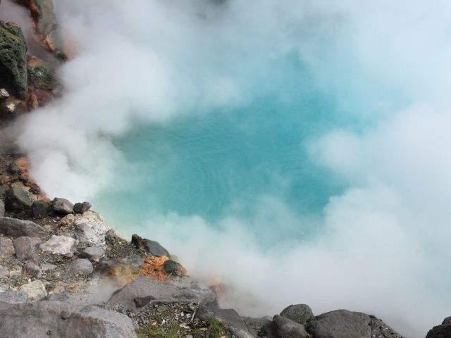 由布岳からも近い別府市の「地獄巡り」を体験。まず冒頭の画像は「海地獄」を映したものだ。この美しいコバルトブルーは、温泉中の成分である硫酸鉄が溶解しているためなのだそうである。次の画像は「血の池地獄」を映したものだ。この美しき赤の正体は、酸化鉄や酸化マグネシウム等を含んだ赤い熱泥なのだそうである。次は「鬼石坊主地獄」の粘土質の泥中に湯玉が湧き上がる姿を映した画像だ。その灰色の熱泥が沸騰する様子が坊主頭に似ているので「鬼石坊主」と名付けられたとのことである。そして上の画像は、湯布院町塚原にある伽藍岳(標高1,045m)の中腹にある火口(火口乃泉)を撮影したものである。小さな噴火口(上の画像の左端)ではあるが、グォ~と音を発しながら吹き上げる噴煙を身近に体感すると、根源的な生命力が沸き立つ感じがした。下の三枚の画像は、「火口乃泉(かこうのいづみ)」と称される伽藍岳の火口を、かなり接近して映したものだ。上で紹介した火口のすぐ近くにあり”湯布院の秘湯”とも詠われるのが「塚原温泉・火口乃泉」だ。その鉄イオン含有量が日本一という薄緑色の温泉に入浴して、実際に源泉を口に含んでみたが・・・これは体に効くな~・・・と感じられた。また店舗で販売されている温泉卵も食べてみたが、これも格別の美味さであった。ちなみに、上の画像の火口(火口乃泉)は、受付に申し込めば有料で見学することができる。上の画像は、塚原温泉の駐車場から撮影した噴煙だ。こんなに火口が近いところに、入浴できる温泉施設があるのは、おそらく全国的にも珍しいであろう。そして最後の画像は、由布岳の九合目あたりから撮影した伽藍岳の中腹にある火口である。この活火山の伽藍岳は、鶴見岳を主峰とする火山群の北端にあり、強い存在感を示していた。