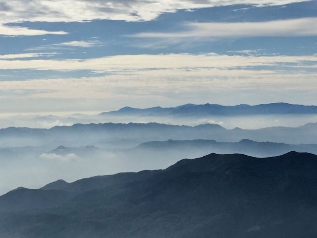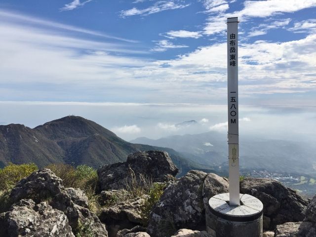 しばらく山道を歩いていて、開けてきた前方の上空を見上げると、そこには由布岳の雄々しき山頂部を展望することができた。その峻厳で美しき山容に、思わず息を飲んだことを憶えている。そして由布岳登山道の、東登山口と正面登山口の分岐点である「日向越」(標高1,065m)に到達。ここからの標高差は約500m・・・このあたりから斜面の角度がきつくなっていくのであった。まだ紅葉の季節とは言えなかったが、いい感じに色付いた紅葉に出会えたので、木漏れ日を背景に写したのが上の一コマ。その緑色から黄色を経て赤色へと、その葉色のグラデーションに癒された。八合目あたりからは、上の画像のようにロープを頼りに登る岩場の急斜面が続き、その難所をくぐり抜けると一気に視界が広がる。下の画像は、九合目あたりから東南方面を撮影したもので、その雲間から降り注ぐ柔らかい陽光に、心が打ち震えた感動の景色である。