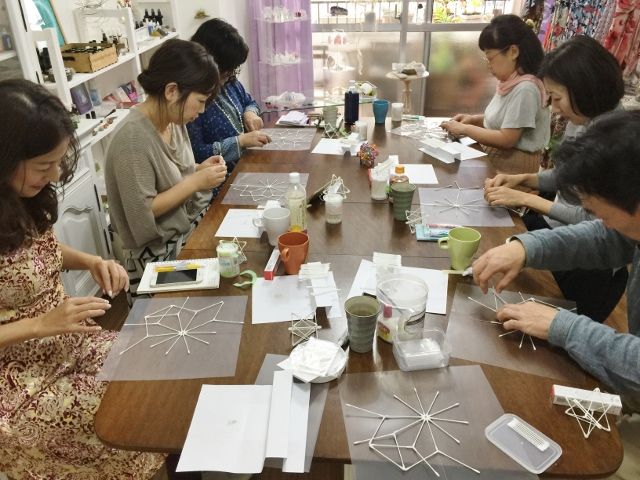 結果として12月21日の「冬至」に開催となった今回のワークショップは、気品あふれる素敵な女性の・・・「十角形」の立体を作ってみた~い!・・・という純真な思いの発露から実現したのだった。一陽来復よろしく冬至日に、皆さんと共に「立体十角形」を制作するというそのココロとは、各人の閉じていた心の扉を開くと日本神話が暗に伝えてきた『岩戸(いわと≒一八十)開き』に繋がる・・・。つまり、一から八までの「八方世界(既存の八方位の枠に囚われた閉じた平面的世界)」から、「十方世界(八方位に天・地を加えて十方位に開いた立体的世界)」へ向うという数理展開を孕んだ『一八十(岩戸)開き』に、各自が意欲的に取り組むということだ。(かなりマニアックな表現になってしまった!)☆関連記事・・・「十」の必然性ということで[呼ばれて飛び出て ジャジャジャジャ~ン♪]と、私こと《ハクション大魔王》は、当日の朝に九州は博多に降り立ったのである。初めて「綿棒工作」にチャレンジする方もいるということだったので、参加者は6名様限定として午前10時頃から始めることに・・・。そこで冒頭と下の画像は、まず各自が平面的に「十角形」を構成していく過程を映したものである。◎関連記事・・・【 立体工作のご案内 】(綿棒で立体を作ってみよう!)この平面図形としての「十角形」を完成させれば、後はある法則性に従って編物をするように交互に編むように構成していくことで、自ずと出来上がる段取りとなっていた。ところが「八角形」までの工程は案外スムーズなのだが、次の「九角形」から「十角形」を形成しようとする最後の締め括りで、ほとんどの皆さんが躓いていたのが印象的であった。それはやはり、今までの人生経験のなかで、このように「十角形」に直接触れるという機会が無かったからであろう。さて下の画像は、今年になって初公開した新作の「立体十角形」を映したものである。今回のワークショップの参加者には、このかなり複雑で緻密な造形の制作にチャレンジしたいという強者もいらしたのだが、現在はまだ非公開ということで柔らかくお断りしたかたちとなったのも印象に残る。以下の関連記事でも、この同じ「立体十角形」を取り上げたが、私自身もこの造形に関しては思い入れが深く、これまで様々な十角形の立体的表現を試みてきたが、特にこの造形表現は「秀逸の一品」となる。☆関連記事・・・そして「十」の世界へ・・・ ☆関連記事・・・『統合の象徴』が律動する!当初予定していたワークショップにかける時間は3時間だったが、何しろ「立体十角形」を複数の参加者と一緒に作るというのは初めての試みであり、また私のつたない四方山話も加わったからであろう・・・なんと1時間以上も押してしまうのであった。それにも関わらず、以下の画像の造形に繋がる基本的な「立体十角形」を組み上げるまで、参加者の皆さん全員が集中力を切らさずに最後まで付いてきてくれたのは有り難かった。その中でも数名の方は・・・図形や工作の苦手な私でもできた~嬉しい!・・・などと歓声を上げてみえたので、指南役の私としても安堵し、ある種の達成感に浸ることができたのだった。 そして最後に浮かんできたのは以下の「回文歌」であった。(当字に工夫有り) なかきよの とおのねふりの みなめさめ なみのりふねの おとのよきかな ( 長き世の 「十」の眠りの 皆目覚め 波乗り船の 音の良きかな )
