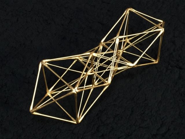 今から約十年前に、「三種の神器」の《 御剣(みつるぎ)》を心に思い浮かべて制作した『 つ る ぎ 』と題する作品があった。(※関連記事⇒『 剣 』の形代 )この造形については、この日記でも何度か取り上げてきたが、その全体構造の中心に「竹軸」を通してこそ完成と判断、さらに造作を洗練し公開した作品が本日の画像である。この上と下の画像は、冒頭の画像の造形を別の角度から撮影したものだ。そして、この画像の造形の中央部には、過去の日記(⇒リンク)に掲載した画像の、「十里(トリ)」という「十進法の数理」を秘めた形代を確認することができる。ある角度から見れば「カゴメ紋」にも見え、数では「十」を暗示する構造を中心部として、それがイメージ的に上下の方向、あるいは天地の方向に螺旋展開した造形が、この『 つ る ぎ 』と題した作品である。 繰り返しとなるが、この造形の中心を貫通する、言わば「天地を貫く御柱」の素材は「竹」であり、この造形の全体を支える「竹」の中心軸が入ったことで、この『 つ る ぎ 』は勇躍して活きてくると感じる。