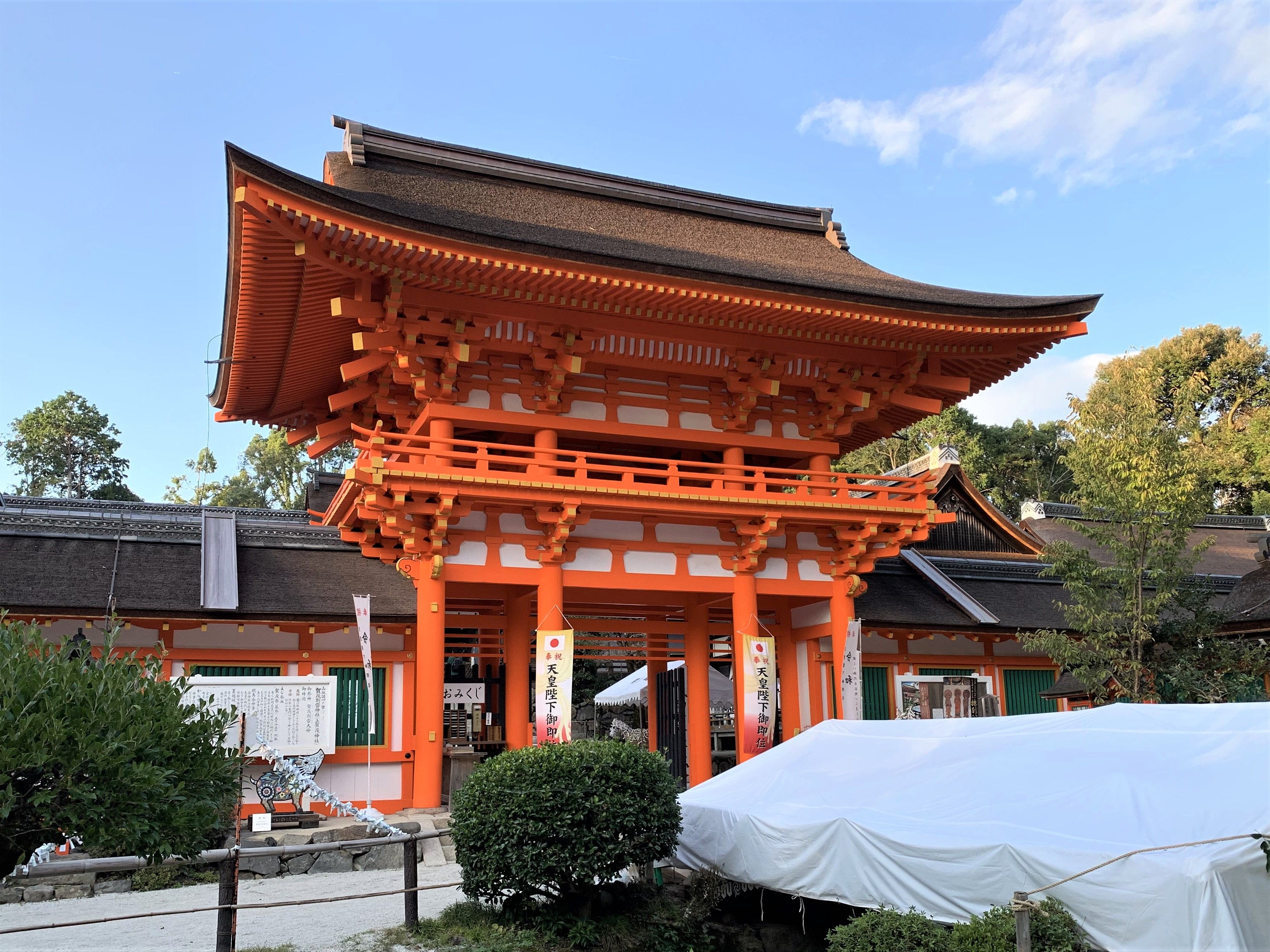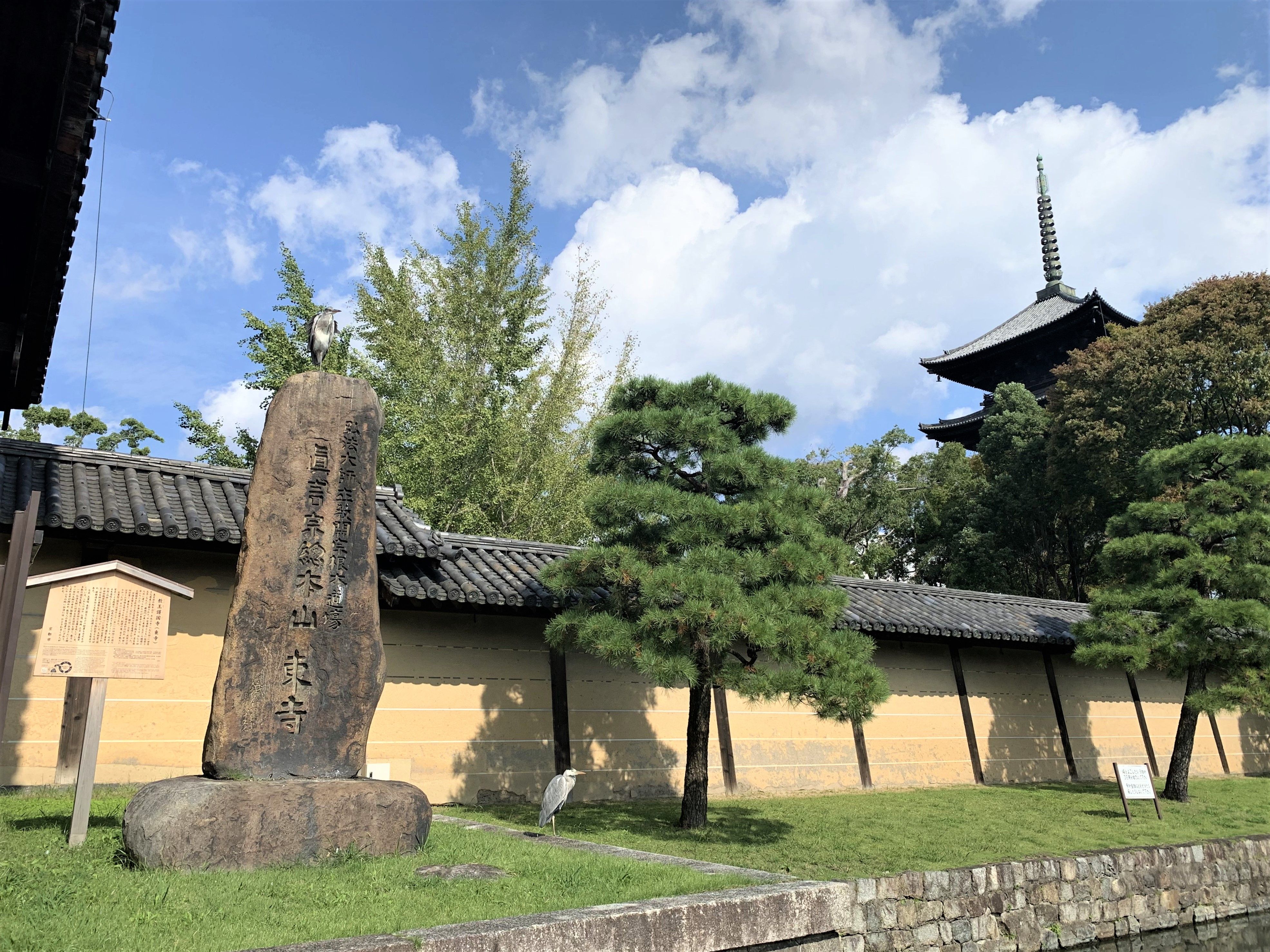 今回の旅路は「奈良」で終焉かと思いきや、やはり「京都」も・・・ということで10月26日は、午前中に奈良から京都へJRで移動、京都駅前でレンタカーを借りて最初に向かったのは真言宗総本山「東寺」(教王護国寺)であった。久しぶりの「東寺」への参詣。そこで冒頭の画像は、東寺 南大門(正門)の手前右手(東側)にある「寺名石標」から、築地塀(ついじべい)越しの国宝「五重塔」にかけて撮影したものである。(※画像の石標の真上と右横の芝生に映る二羽の「アオサギ(蒼鷺)」が微笑ましい。)南大門を入り五重塔のある右手(東側)を見ると、その手前には上の画像のように社殿が鎮座している。この神社は東寺が創建される以前からこの地を守護してきた地主神を祀る「八島殿」(やしまでん)である。上の画像に映る由緒に、当社の祭神は「大己貴神(大国主命)」とあるのだが、かつて私が最初に東寺を参詣した折、下の画像に映る東寺の寺紋「八雲紋(やくものもん)」の由来について寺務所で尋ねたところ、この出雲系の地主神を境内で祀る「八島殿」の御紋とする見解を僧侶から聞いたことを憶えている。そこで、かつて上の画像の「八雲紋」について書いた日記が、以下にリンクした関連記事である。※関連記事・・・「 八雲の紋 」京都 東寺と出雲を結ぶ謎(2005年6月29日 )次に、同じく南大門を入り、左手(西側)に鎮座する神社が「八幡社殿」である。下の画像の由緒とは別に、弘仁元年(810年)の〔薬子の変〕に際して、「空海」が嵯峨天皇の勝利を祈願して八幡神をまつり、社殿を建立したのが開創とされる。加えて上の由緒にあるように、本尊である国宝「八幡三神像(僧形八幡神と二尊の女神)」は、「空海」が一本の霊木から造り出した貴重なものとされ、秘仏として古くから大切に保存されてきた日本最古の神像と伝わる。そして南大門の真正面にある建物を映した上の画像は、国宝「金堂」(本尊 薬師三尊)の全体像である。 この「金堂」は東寺の本堂であり、延暦15年(796年) 東寺の創建時に建立された最初のお堂(現存の建物は1603年に再建)とされている。「金堂」の北側にあって、「空海」が密教の教えを伝える中心的建物として位置づけ、伽藍の中央に配置したとされる「講堂(こうどう)」を撮影したものが上の画像である。堂内には密教の教えを視覚的にあらわす曼荼羅を、21体の仏像を使って立体化した「羯磨曼荼羅(かつままんだら)」…通称「立体曼荼羅」…を安置する。実は、この「講堂」に安置された21体の仏像のうち15体の仏像が、「東京国立博物館」で開催された特別展「国宝 東寺―空海と仏像曼荼羅」に展示期間中の今年5月、たまたま上京していた折に見学に訪れたことが契機となり、書いた日記が以下のリンクである。※関連記事・・・持参した「立体七角形」と「八雲紋」の遭遇最後に「東寺」といえば、京都のシンボルともいえる国宝「五重塔」が有名だ。(上の画像)この東寺の「五重塔」は日本一の高さを誇る木造塔(54.8m)で、天長3年(826年)に「空海」が金堂に続いて創建に着手した建物である。(※現在の五重塔は寛永21年(1644年)に再建)内部には下の画像に映る解説にあるように、心柱を大日如来に見立て金剛界の四仏像と八大菩薩像が安置され、壁や柱には金剛界曼荼羅や八大龍王、真言八祖像が描かれている。