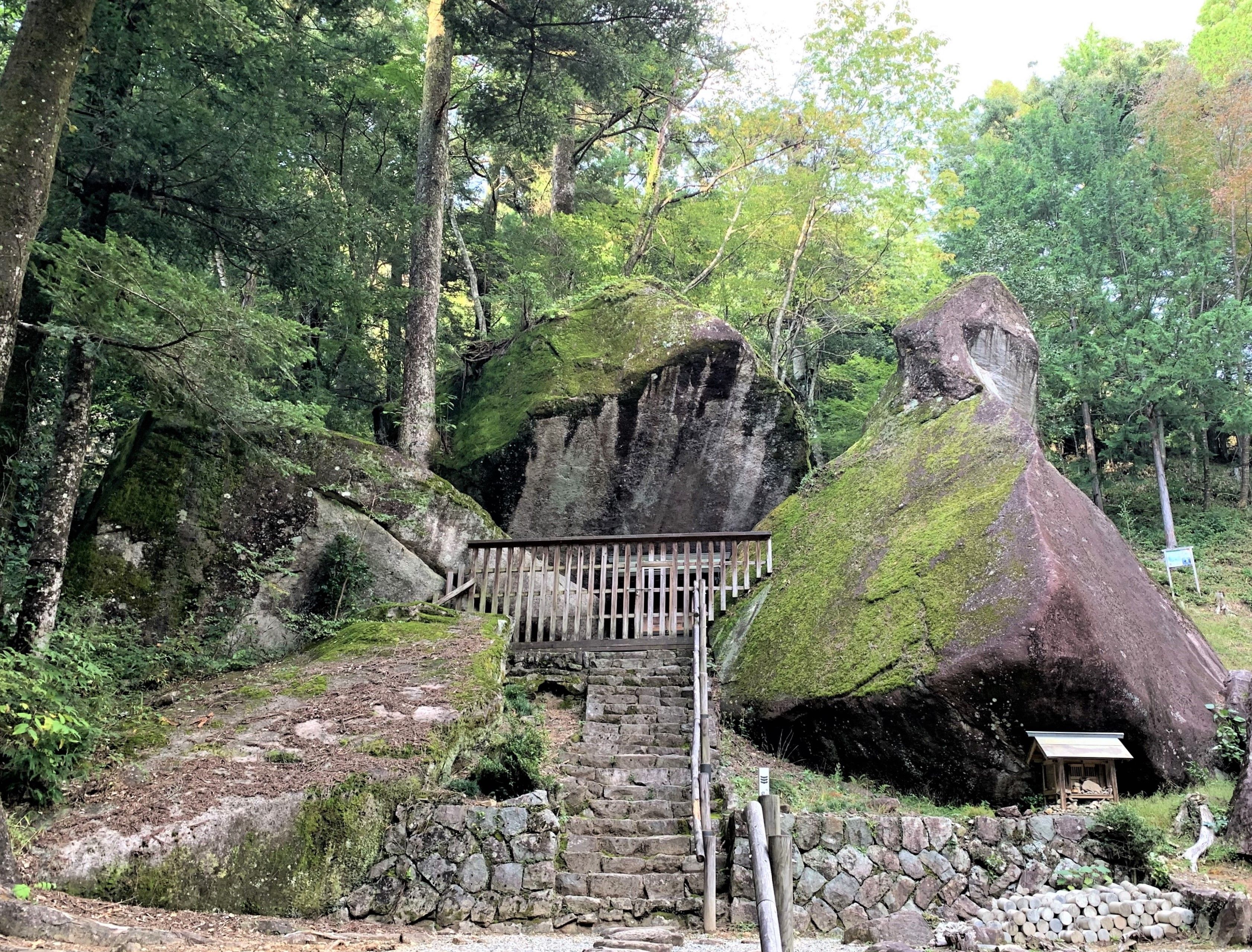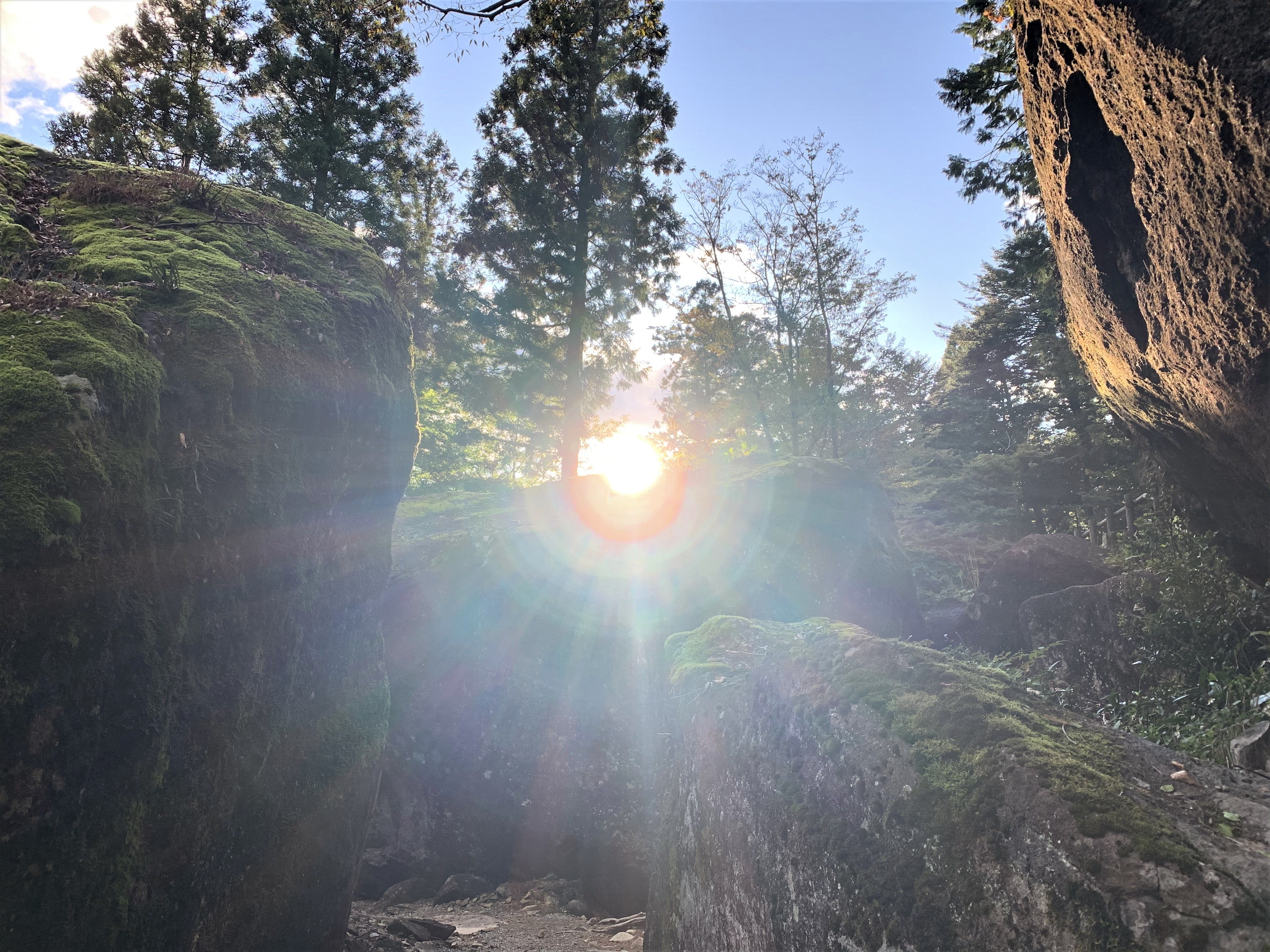 〔二十四節気〕の第18、「霜降(そうこう)」の月日とされる先月10月23日、岐阜県下呂市に存在する「金山巨石群」を訪ねる運びとなった。思い返せば、当巨石群を訪れるのは今回で4回目となる。かねてより関心を寄せていた、冬至約60日前(冬の始まり)の昇る太陽を観測するツアーに参加するため、前日22日から下呂市に入り宿泊地へ向かう道すがら当巨石群に寄ることにした。そこで冒頭の画像は、折しも「即位礼正殿の儀」が行われた10月22日の午後4時頃、金山巨石群内の「線刻石のある巨石群」に注ぎ込む清々しき陽光を撮影したものである。次に上の画像は、金山巨石群内にあって〔神殿〕を思わせる「岩屋岩陰遺跡巨石群」を、右手前に映る巨石のカッティングが際立つよう少し斜めから撮影したものだ。この「金山巨石群」については、当日記でも何度か取り上げているが、これら巨石の石組みや配置等、古代人が緻密な計画のもとに設営したであろう「天体観測所」は、その場所としても日本列島の【中央】を担う祭祀場として相応しいと思われた。☆関連記事(一回目の探訪記)・・・「春」の旅日記(15)☆関連記事(二回目の探訪記)・・・「秋」の旅日記(22)… 金山巨石群(一)☆関連記事(三回目の探訪記)・・・列島「中央」への探訪(2)たまたま現地に到着したときが、巨石群の狭間に沈む夕日を観測できる時間帯だったこともあり、この上下の画像ようなシャッターチャンスを掴むことができた。この「冬の始まり」を象徴する太陽と巨石群との響き合いは、日本列島の「冬の南北軸」と自称する〔山口と九州を貫く南北軸〕とも共振するように感じられ、此処に来た意味を改めて噛み締めるのであった。※関連記事・・・由布岳(豊後富士)を展望しつつ・・・そして下の画像は、上掲画像の「金山巨石群」に至る道中に、まるで導かれるかのように辿り着いた「戸隠神社(九頭の宮)」(岐阜県郡上市和良町)の境内に存在する「重ね岩」と名付けられた岩座を撮影したものである。当社殿の背後にあって、少しの揺れでも体勢が崩れてしまいそうな絶妙な石の配置が現存する風情に驚嘆、また同じ境内の全部で九つとされる岩座群を観て歩いているうちに、上記の「金山巨石群」を含む「奥美濃」地域における岩座信仰の奥深さを感じた次第である。(※最下の掲載画像は岩座群の解説版)