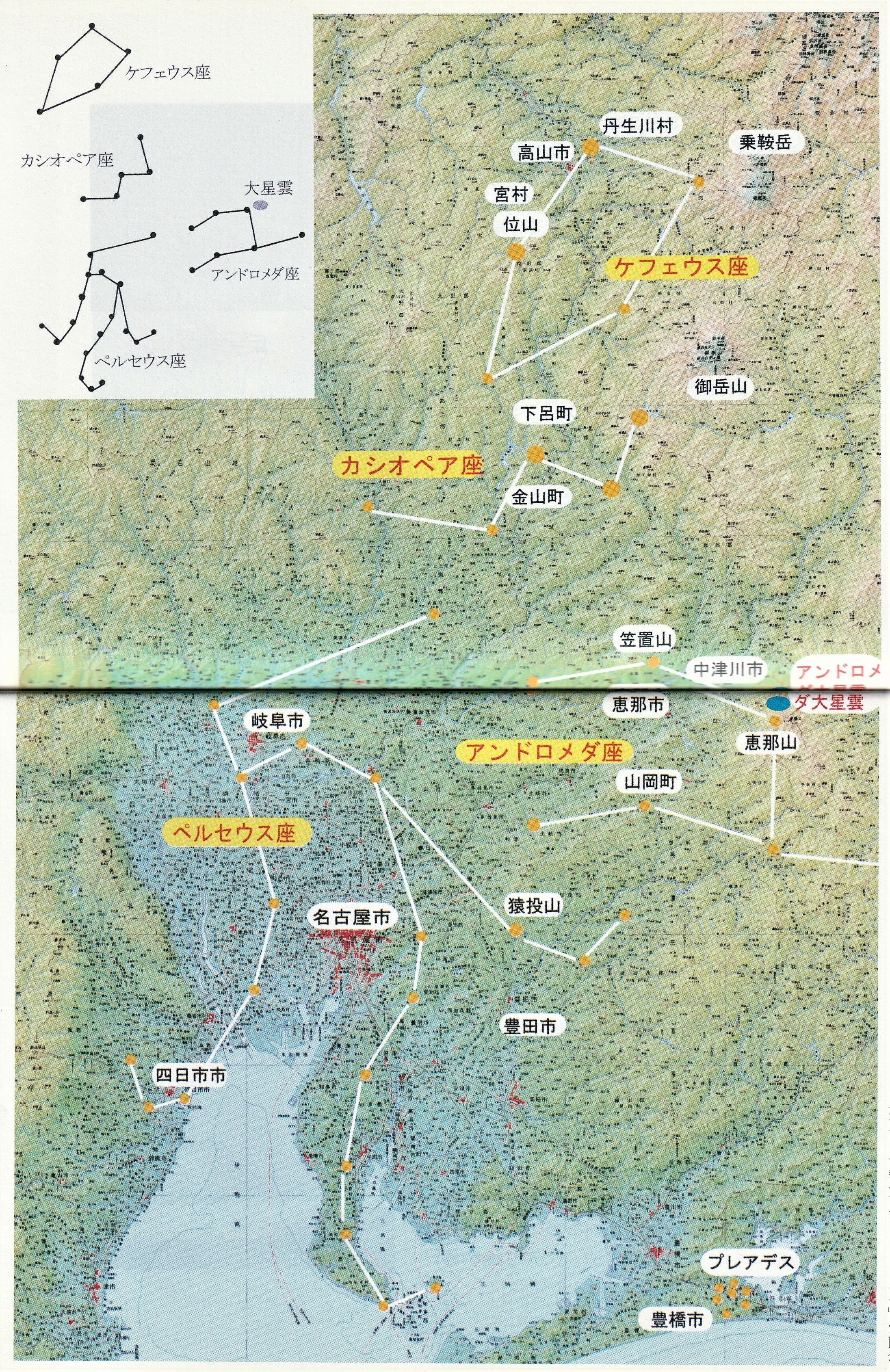 実は今回の中部地方の東海から中央高地にかけての旅路に関しては、その背景に冒頭画像の「天体の地上投影図」があった。(※書籍『星空の卑弥呼』榊 晶一郎 著・星雲社 2004年刊より)今回の旅路の前に、この地域に関連する様々な情報に目を通していたのだが、その出発の直前になって再確認できたものが、上掲の星座が描かれた地図である。つまり上掲画像を参考にすれば、初日に訪れた奥美濃の「金山巨石群」は、「カシオペア座」を形成する星々が地上の各地に投影されたなかの一所、また同様に飛騨の「位山」は、「ケフェウス座」の星々が地上投影された各地のなかの一所という、まさに天空に輝く星座と大地に座す巨石群が相呼応し共振する感覚で、上記二ヵ所を訪れることになったわけである。ここで興味深いのは「ギリシャの星座神話」において、冒頭画像の地図に描かれた四つの星座は、古代エチオペア王家にまつわる星座神話として描かれているということだ。簡単に解説すれば、「ケフェウス(座)」はエチオペアの国王で、「カシオペア(座)」はその王妃、そして「アンドロメダ(座)」は、国王と王妃の間に生まれた王女であり、この王女を助けたのが「ペルセウス(座)」というように、そのままの名称で星座の物語が展開するのである。そこで、ケフェウス国王の聖地たる「位山」とカシオペア王妃の聖地たる「金山巨石群」を訪れたのであれば、アンドロメダ王女にまつわる聖地も訪れてみたいと思うのが道理だが、そのアンドロメダ座を形成する星々の投影地のなかで最大の聖地と考えられるのが、「アンドロメダ大星雲」の投影地とされる美濃の最高峰「恵那山(えなさん・標高 2,191m)」である。(※冒頭画像の「天体の地上投影図」を参照)もちろんというか、さすがに登山口から山頂まで標高差約1,100mの恵那山に登る体力は残っておらず、近場から恵那山を遥拝しようと目論んだ10月25日は朝から雨に見舞われたので、当日は恵那山の東方に鎮座し今回で三度目の参拝となる「阿智(あち)神社」(長野県下伊那郡阿智村)を訪ねることにした。そこで上の画像は、延喜式内社 阿智神社(奥宮)の入口と、由緒が書かれた解説版を撮影したものだ。次に上の画像は、阿智神社(奥宮)と御神前に設えられた石舞台を撮影したものである。ちなみに、この阿智神社の主祭神「思兼(オモイカネ)命」は、天照大神が「天岩戸」にお隠れになった際に「岩戸神楽」を創案し、閉ざされた岩戸を開くきっかけを作った〔智慧の神〕とされている。社殿右側の丘陵地を映した画像が上で、この石段を登った鳥居の前方に、上掲の解説版に記された古代祭祀場の核となる「磐座」が祀られている。まずは奥宮へ参拝した後に石段を登り、鳥居の前から元宮の「磐座」を撮影した画像が上である。この「磐座」が存在する丘陵地にある解説版を映した画像が上、そしてその「磐座」が示す方位の「東」を上にして映した「磐座」の画像が下である。おそらく古代人によって選別され加工された「磐座」が、下の画像のように「東西南北」の方位を示す〔菱形状〕に整えられたのは、この解説版にも書かれているように、古代の「太陽信仰」に由来するのではないかと感じた次第である。ところで下にリンクした、かつて日本列島の「中央」を意識して周遊した探訪シリーズには、前回の二度目に参拝した際の「阿智神社(奥宮)」について書いた記事が最後の(4)に含まれている。当時は冒頭の「天体の地上投影図」を全くと言っていいほど認識していなかったのだが、2015年の「春分の日」に「金山巨石群」を見学し、次に「アンドロメダ座」の星が地図上に投影された「笠置山」の山中に点在する巨石群を見てから、上記の阿智神社に参拝するという旅路となっていた。※関連記事・・・列島「中央」への探訪(1)※関連記事・・・列島「中央」への探訪(2)※関連記事・・・列島「中央」への探訪(3)※関連記事・・・列島「中央」への探訪(4)ここまでの旅路を回想すると、冒頭に掲げた地図を頼りに特に三つの星座(ケフェウス・カシオペア・アンドロメダ)の投影地を意識して巡ることができ、その旅路の過程がとても有意義であったと思う。そして当初は想定していなかったのだが、この地域の旅路で最後に辿り着いたところが「阿智神社」だったのは、やはり古代日本の言わば「中央(太極)」の祭祀を担っていた〔阿智族〕の、有り難き御導きがあったものと感じるところである。※関連記事・・・〔三部神道〕とは・・・※関連記事・・・「オモイカネ」の御歌について☆さて、このシリーズには続きがあり、図らずも今回のタイトル…【中央】を担う祭祀場を巡る…を繋いでいくかたちで翌10月26日には「奈良」、そして27日には「京都」へ行くことに・・・。それでは、乞うご期待!