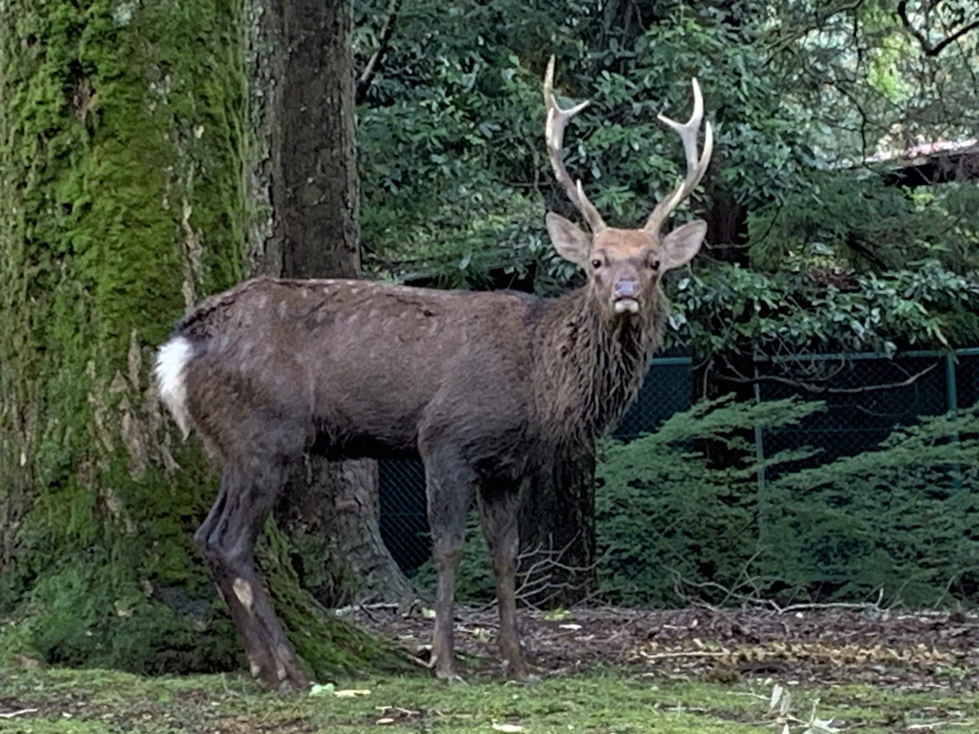 10月26日は午前中にJR奈良駅に到着。レンタカーを借りて最初に向かったのは「東大寺」であった。第45代 聖武天皇の詔により「東大寺」が創建される際、その造立の建築材料となる木材や金属等を産出する御料地が現在の山口県域に選定された背景に、古代日本の「陰陽五行」による呪術があったことに気づいたことが契機となり、かつて同天皇にまつわる治績をうかがうべく全国各地を訪ねる長旅にも出たことがあった。※関連記事・・・大仏造立と呪術※関連記事・・・「春の旅」の締め括り(上)さて冒頭の画像は、東大寺の境内に鎮座する「手向山八幡宮」に向かう道すがら遭遇した牡鹿である。境内で見かけた多くの牡鹿は、そのほとんどが根元から角を切られていたのだが、この画像に映る鹿だけは立派な角が生えていた。これまで野生の鹿をはじめ多くの鹿を見てきたつもりだが、この鹿の角が最も威厳に満ち生き生きとしているように感じた。長い参道を経て、ようやく辿り着いた当社入口となる鳥居を撮影した画像が上だ。疫病や社会不安から国を鎮護するための国家的大事業として東大寺が建立されていた折、全国八幡の総本宮「宇佐神宮」の八幡大神より「天の神、地の神を率いて、わが身をなげうって協力し、東大寺の建立を必ず成功させる」という協力の託宣があったとされる。(手向山八幡宮の由緒は以下の画像に掲載)これまでも東大寺には何度か訪れているが、この八幡宮に近い「法華堂(三月堂)」の堂内に入り、本尊を拝観したのは初めてであった。ちなみに「法華堂」は、天平時代に建造された東大寺最古の建物とされ、また東大寺の前身寺院である「金鍾寺」の遺構と伝わる。(画像なし)さて「法華堂」の初参詣を経て訪れたのは、「お水取り(修二会)」で聞こえた「二月堂」であった。かつて「二月堂」には、特別に十本の「松明(たいまつ)」が灯る「修二会」の最終日に、たまたま参詣したことがあり、私にとっては思い入れの深い寺院のひとつである。※関連記事・・・「春」の旅日記(6)そして上の画像は、あの松明が灯っていた「二月堂」の回廊隅より東方を映したもので、その前方の森林に囲まれて屋根の上部だけが見える建物が「東大寺大仏殿」である。さて、いよいよ「東大寺大仏殿」の全体像が展望できる場所へ・・・。正式には「東大寺金堂」と称する巨大建造物を撮影したものが上の画像だ。その大きさは、高さ46.8メートル、間口57メートル、奥行50.5メートルで、高さと奥行は創建時とほぼ変わりないが、東西の幅は約3分の2に縮小されているということである。上の画像は、聖武天皇の発願によって造立され大仏殿(金堂)に安置された国宝「銅造盧舎那仏坐像」(奈良の大仏)である。 その像高14.7mの巨大な仏像は、有無を言わせぬ存在感に満ち溢れていた。冒頭では山口県域が東大寺の造立建材を産出する御料地と記したが、それを証明する事例として1988年3月、橿原考古学研究所が東大寺大仏殿の西廻廊付近から検出された大仏鋳造用の青銅を分析した結果、東大寺の大仏の銅は山口県美祢市にある日本最古の「長登銅山」の銅であると発表されている。◎関連サイト・・・長登銅山跡 大仏ミュージアムこの模型は大仏殿内の後方にあった展示物の一つで、『東大寺要録』や『正倉院文書』を参考に創建当初の伽藍の様子を50分の1に縮小・復元したものである。大仏殿は現在のものに比べて東西(左右)に大きく、100mに達する東西の両塔(七重塔)がそびえていたということだ。※関連記事・・・九州東岸域の日向物語(4)ここで東大寺の「大仏殿(金堂)」および「七重塔」に関して、私なりに感じていた建築構想の背景を披露すると、本尊の安置された「大仏殿」が極北の夜空に輝く「北極星」を象徴した建造物であり、東西に配置された二塔の「七重塔」は、太極たる「北極星」を中心に巡る陰陽二元の「北斗七星」を象徴する建造物であったと思われる。躍動感あふれる木像を映した上の画像は、東大寺「南大門」の門の左右に安置された国宝「金剛力士像(仁王像)」二体のうち、高名な仏師の〔運慶・快慶〕が制作したと伝わる「阿形像」である。この仁王像二体は、昭和63年から5年間にわたって全面解体修理が行われ、天平創建期から向かい会って立っていたことや、山口県で伐採された木材が約1年で搬送され、古文書の記述通り約70日間で二体が同時進行で造像されたことも証明されている。(※現在の仁王像は鎌倉時代に再建されたもの)◎関連サイト・・・「重源の里」(東大寺再建に尽くした重源上人のテーマパーク)そして次に「平城宮跡」に向かう道すがら、まるで導かれるかのように通りがかった「御陵」を映した画像が下の画像である。聖武天皇の御陵「佐保山南陵」は、いつもと変わらぬ穏やかな静けさで、今日の奈良を見守っていた。