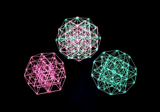 そのときに持参した構造があった。それが今日の掲載写真にある3つの構造の内の手前の2つの構造である。向かって右側の緑色の構造が、「調和」をあらわす造形で、向かって左側の桃色の構造が、「愛」をあらわす造形だ。