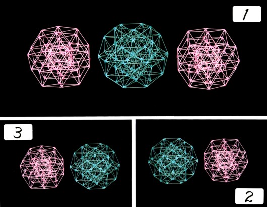 今日の画像は、以下の説明の中で、その「男雛」と「女雛」が区別しやすいように、双方を色分けした「見立ての造形」であらわしてみた。つまり、「男雛」が「緑色」、そして「女雛」は「桃色」という色分けである。そして、《1》《2》《3》と三種類の「配置」を用意した。