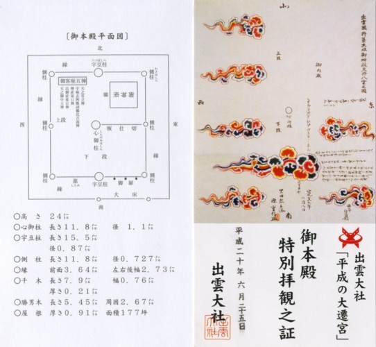 その知人は開口一番に、御本殿の天井に描かれた「八雲」の図(画像の右上の絵図)のことを話された。その躍動感にあふれる「雲紋」は、まるで生きているような印象を受けたそうである。画像の絵図を見てもらうと分かるように、「八雲」の図とされていながらも描かれている「雲紋」の数は七つということで、それが何故なのか拝観時の説明を聞いても判然としなかったということであった。