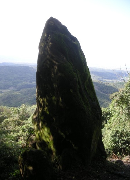 そこで今日の画像は、その九州滞在の最終日(10月31日)に、ストーンサークルで名高い猪群山(いのむれやま/大分県豊後高田市にそびえる標高458mの山)の中腹で撮影した、約4~5mの高さの直立する美しい岩だ。