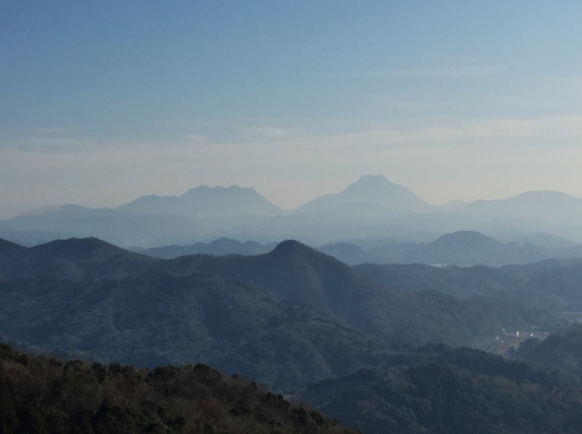 遠方に霞んで見える山並みの中央部に、ひときわ輝く秀麗な山が「豊後富士」とも謳われる「由布岳」である。ちなみにその左側の山は、大分県別府市にある「鶴見岳(つるみだけ・標高1,375m)」だ。