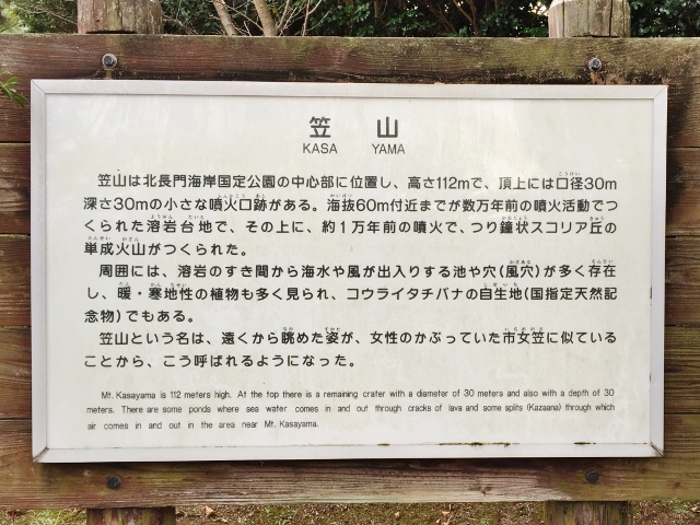 この「笠山」は、下の画像の解説版にあるように、北長門海岸国定公園の中心に位置し、山頂に直径30m・深さ30mの噴火口がある「世界最小の活火山」とも称されており、約1万年前に形成されたと考えられている。