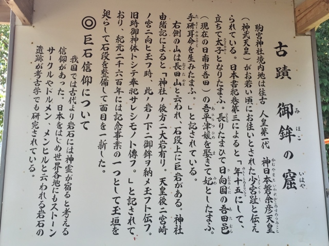 上の画像は、その「御鉾の窟」を解説した看板を写したもので、当社の境内地は人皇初代の神武天皇が幼少期を過ごした場所だったとあり、感慨深く拝読したことを憶えている。