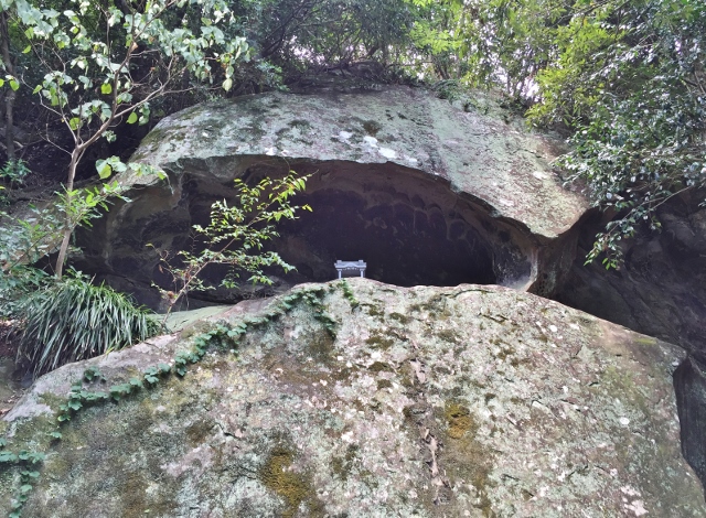 そこで上の画像は、宮崎県日南市に鎮座する駒宮神社の境内にある「御鉾の窟」という巨大な磐座を撮影したものである。カメラに収まりきらないほどの巨石だが、名称の「御鉾」が暗示するように、その全体を俯瞰すると男性原理を模した造形のようにも感じる。