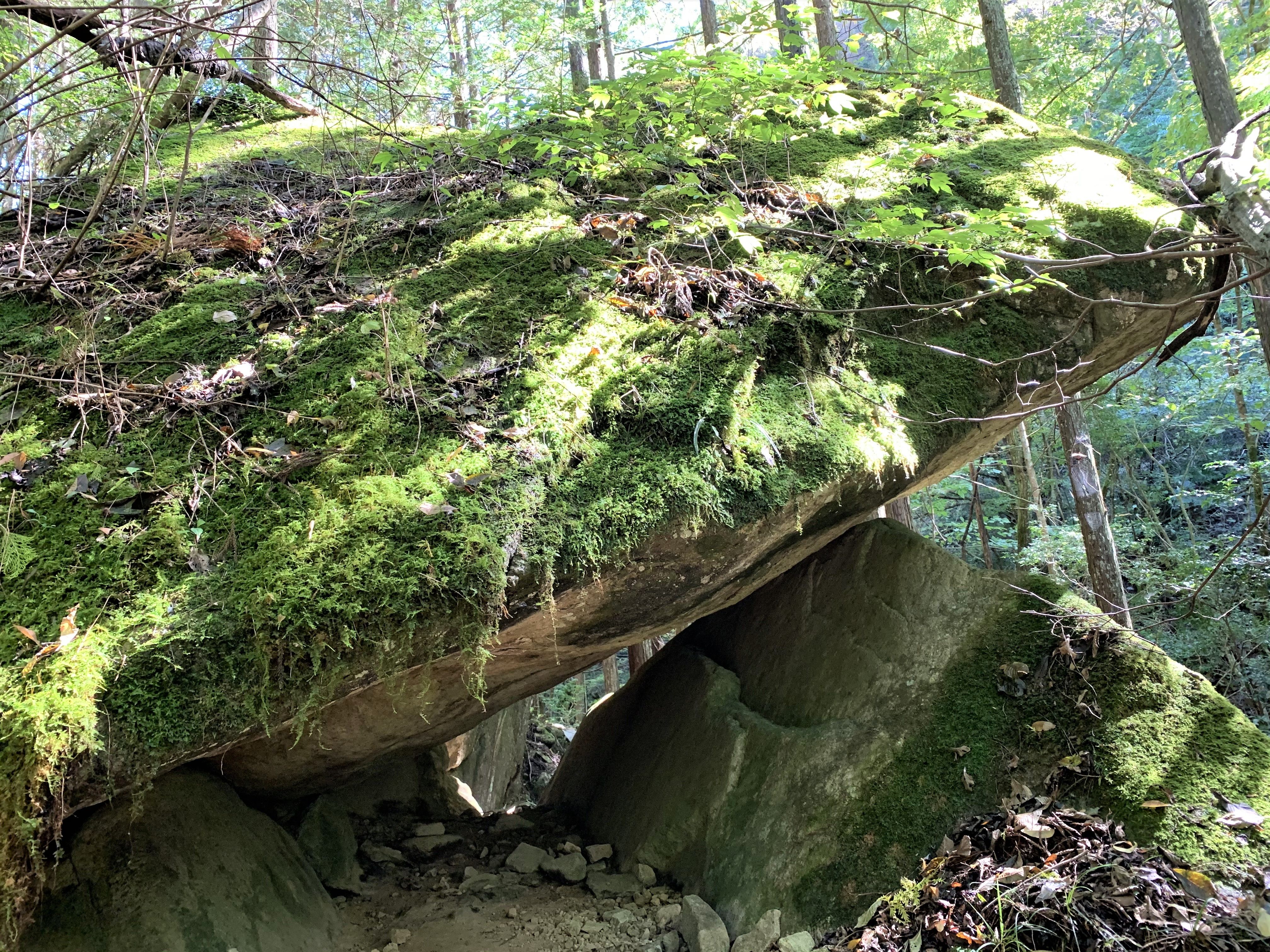 実は下山途中に、その「ある場所」と思しき…名も無き「磐座」…に案内してもらうことができた。そこで上の画像は、その谷間に存在する「磐座」の全体像を下方より撮影したものだ。