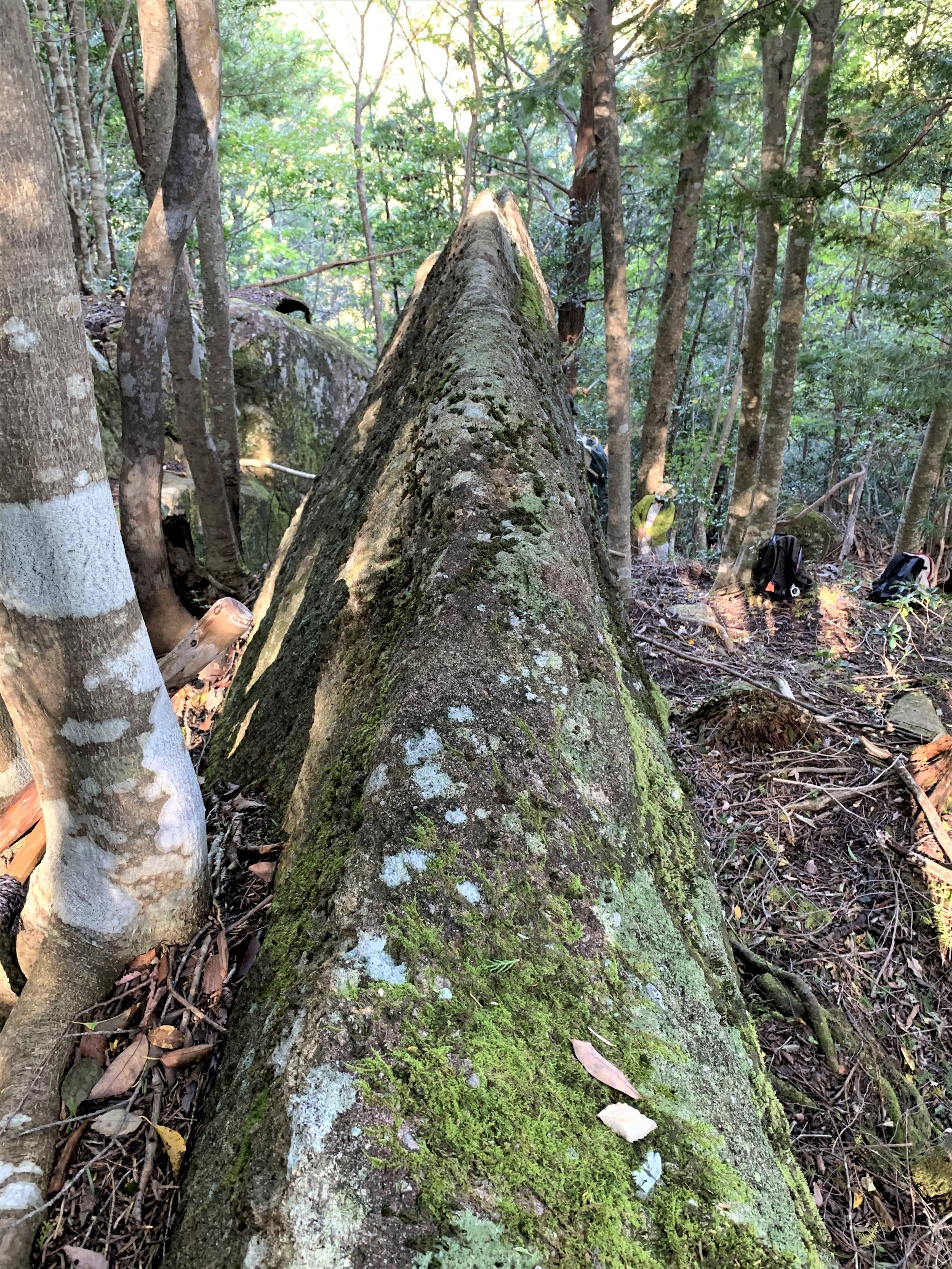 そして当日の朝8:30に約10人の有志が現地集合し、「東の山巨石群」のある山上まで片道約50分の登山。登山の参加条件は「健脚者のみ」とあったのだが、なるほど登山道の無い獣道は予想以上に険しかった。