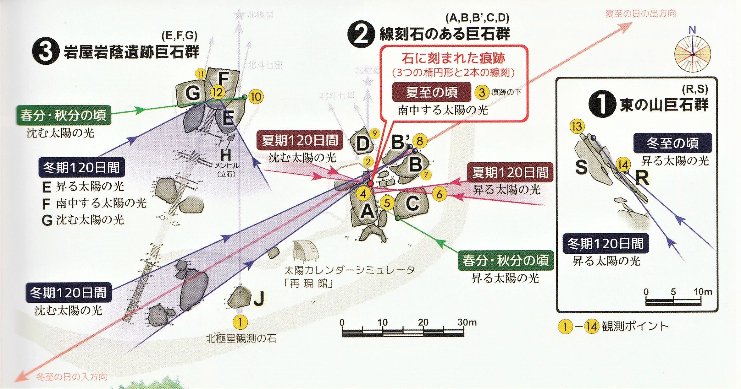 その内の「岩屋岩陰遺跡巨石群」と「線刻石のある巨石群」の2つは山の谷間に位置しており、その谷間の方向(赤色の軸線)は「夏至の日の出方向」と「冬至の日の入方向」を示している。