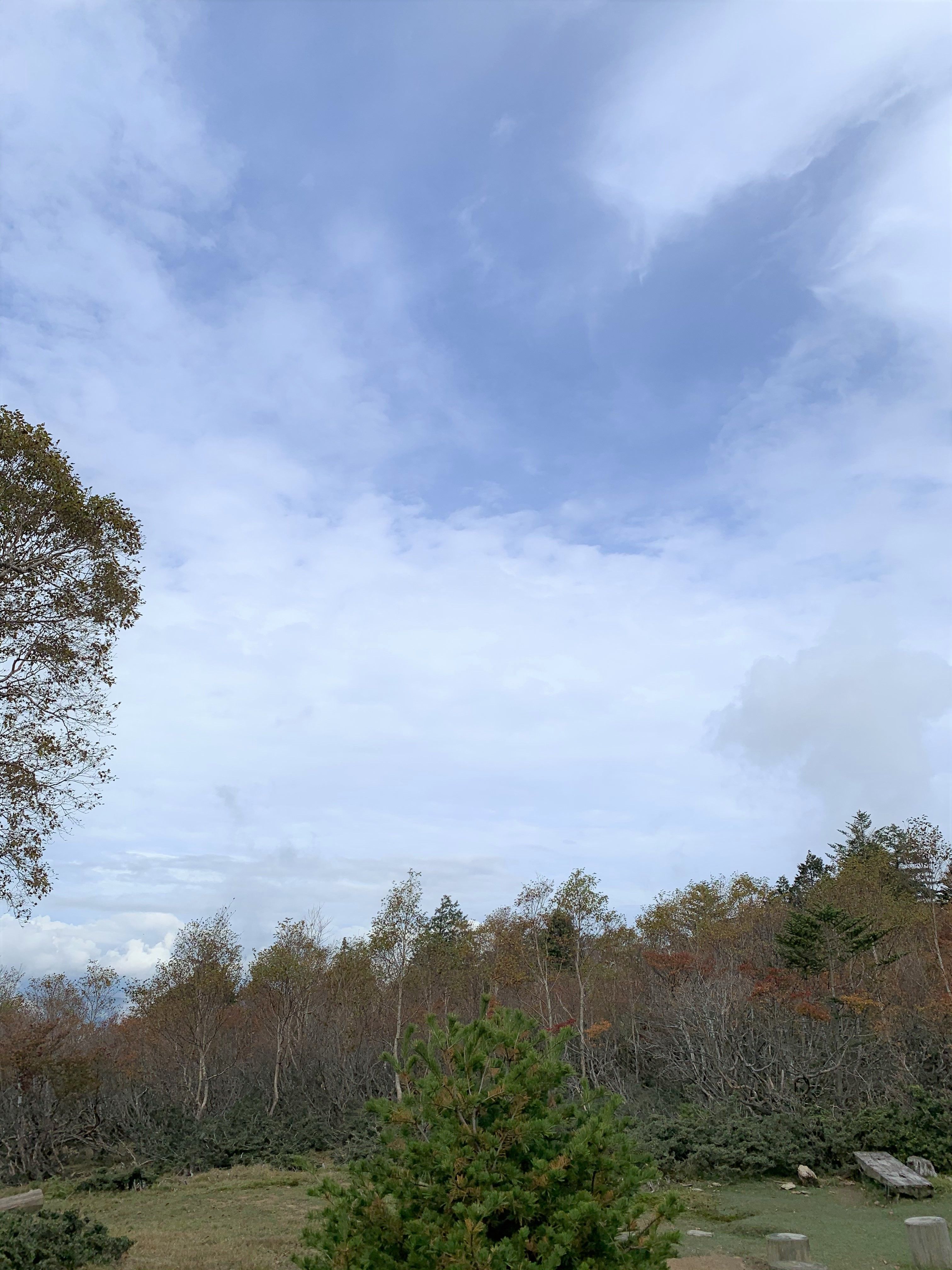 上の画像は頂上近くにある展望広場を撮影したものだ。この頃になると雲間に太陽の輪郭が見えてきて、上空にも青空が広がり始め、新たな展望が開いていくかのような嬉しい気分になるのであった。