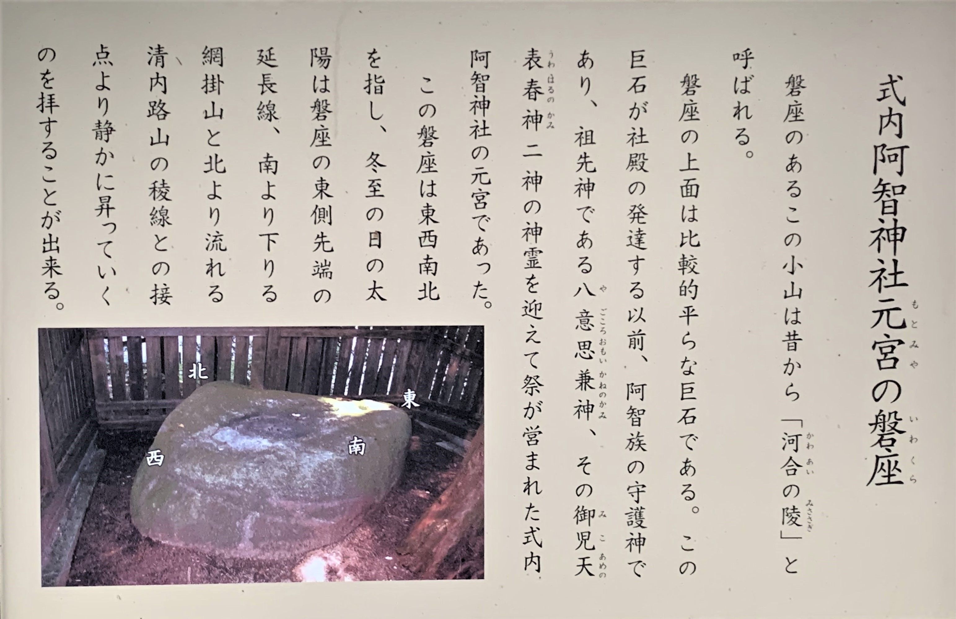 おそらく古代人によって選別され加工された「磐座」が、下の画像のように「東西南北」の方位を示す〔菱形状〕に整えられたのは、この解説版にも書かれているように、古代の「太陽信仰」に由来するのではないかと感じた次第である。