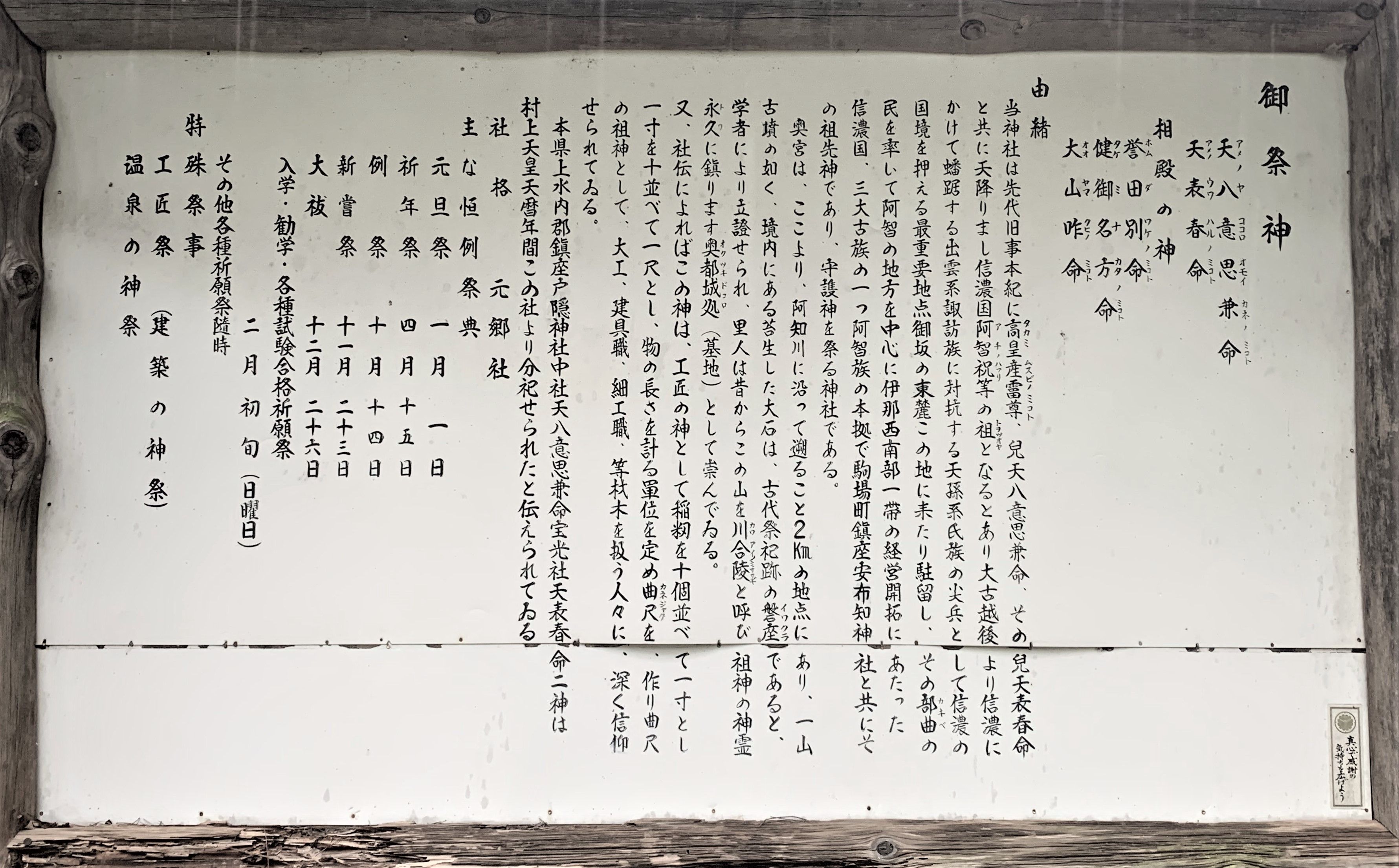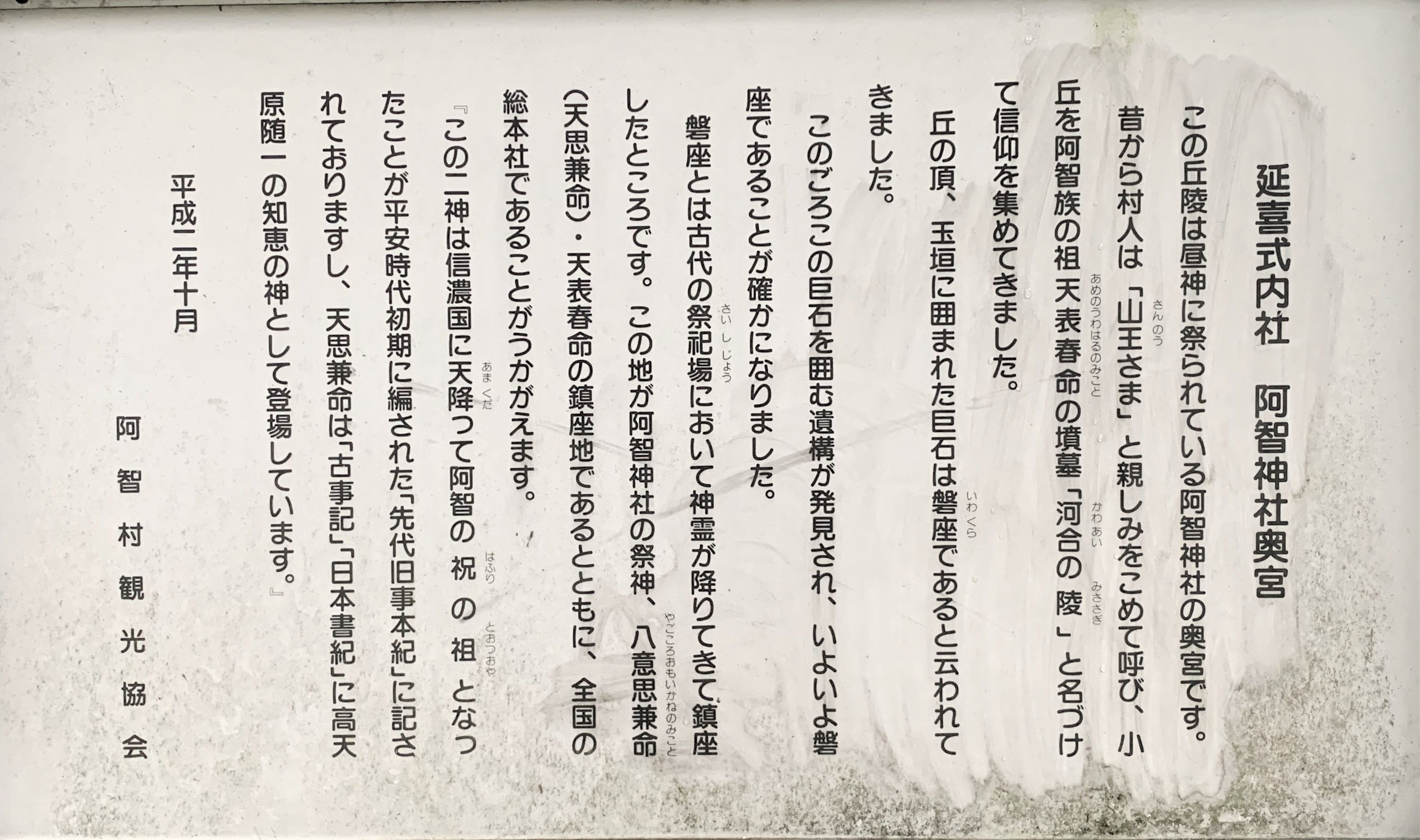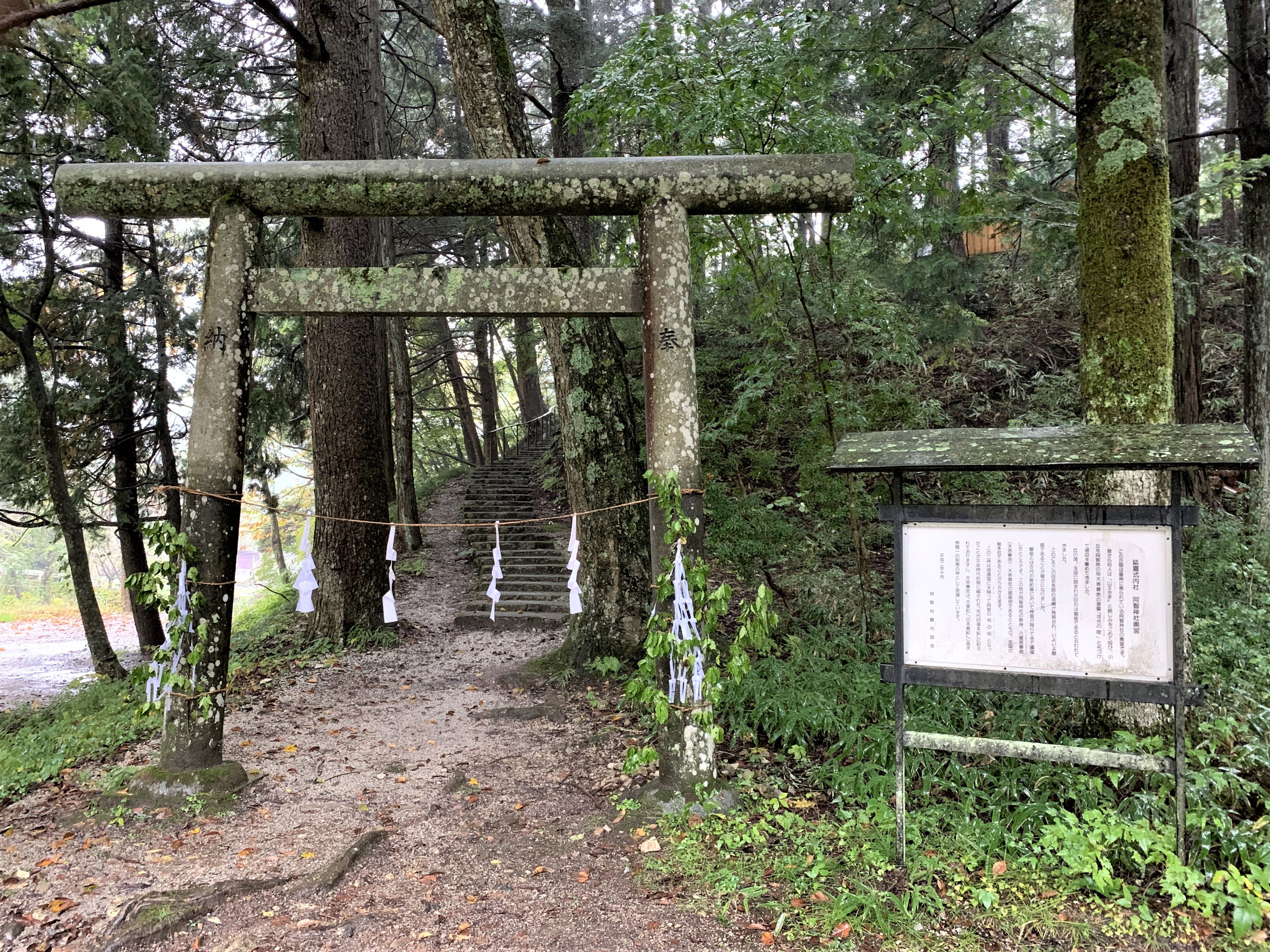 そこで上の画像は、延喜式内社 阿智神社(奥宮)の入口と、由緒が書かれた解説版を撮影したものだ。