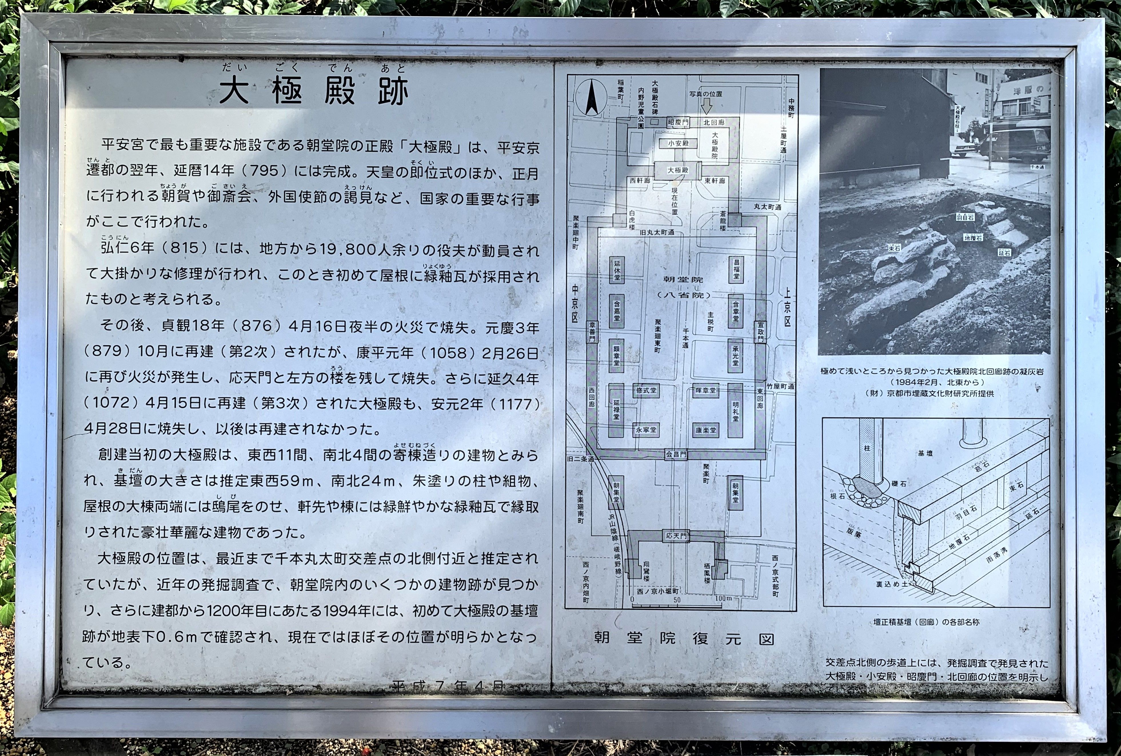 そこで上の画像は、1895年(明治28年)に平安遷都1100年を記念して建てられた石碑を撮影したものである。その石碑には「大極殿遺阯」と刻まれている。(京都市中央区千本丸太町)