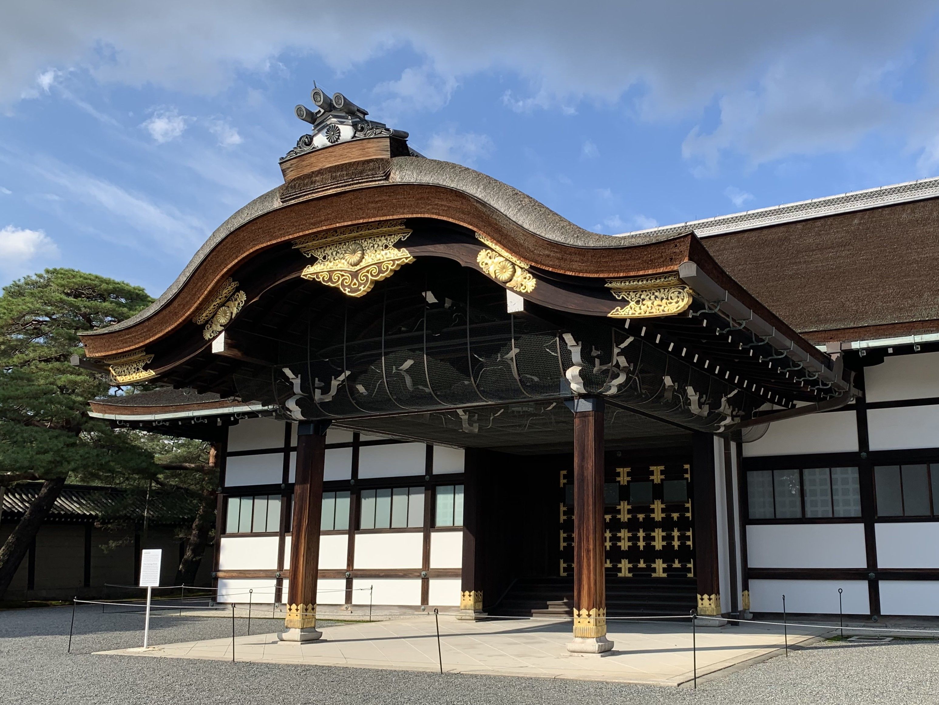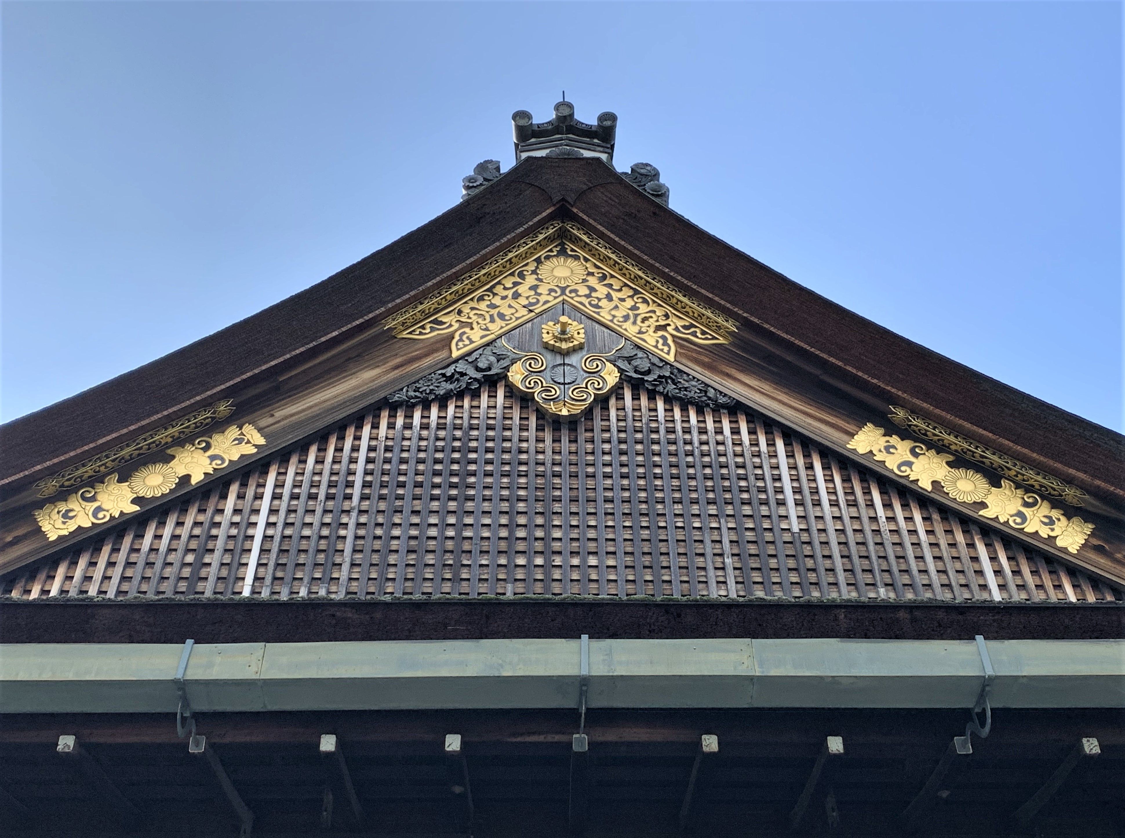 そこで上の画像は、入場門を通過してすぐの皇族専用の玄関「新御車寄(しんみくるまよせ)」を撮影したもので、まずその優美な建築様式や雅やかな意匠に魅了された。