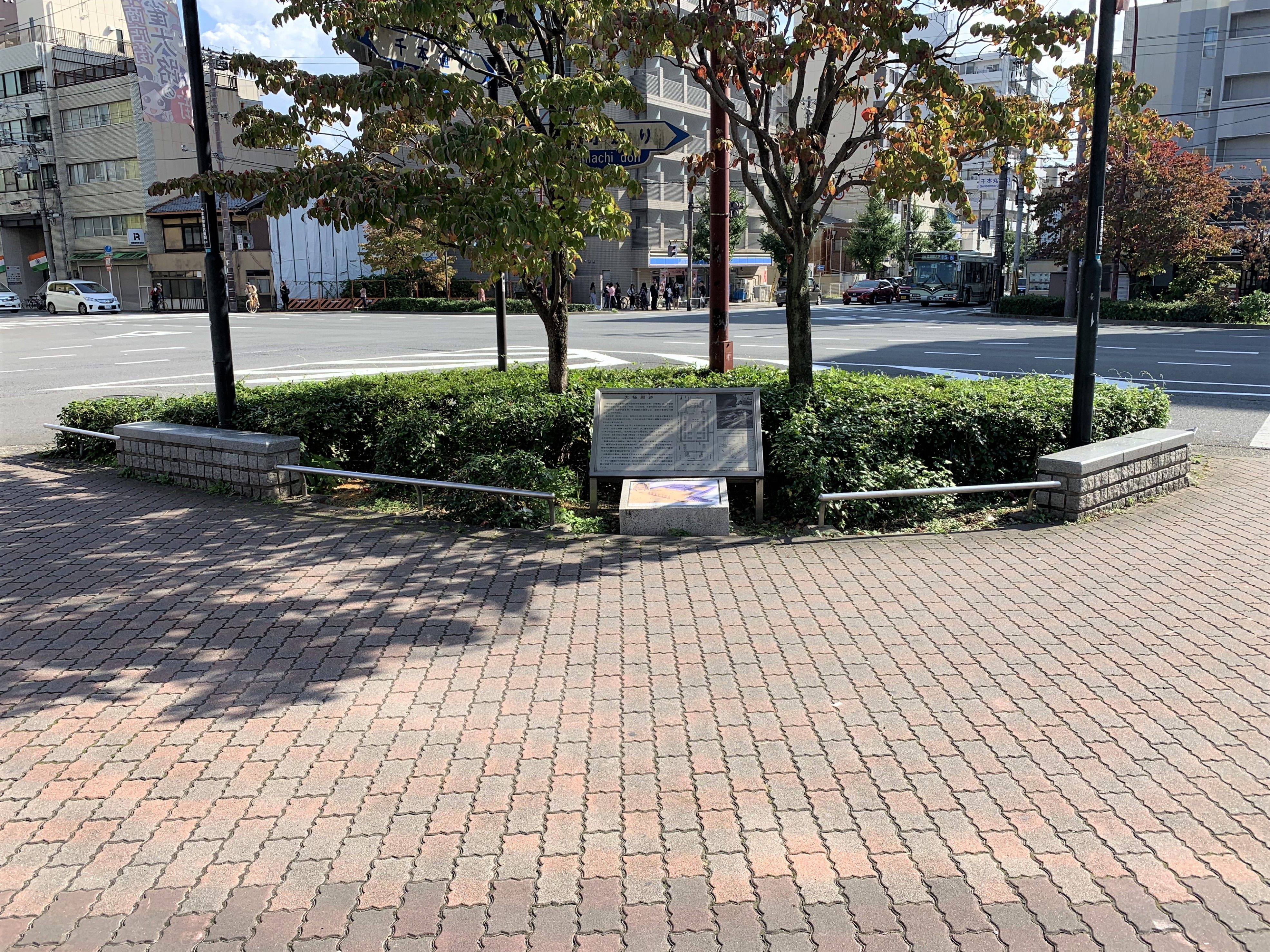 ただし近年の発掘調査によって、その「大極殿跡」は冒頭画像に映る石碑の付近ではなく、千本通(朱雀大路)と丸太町通の交差点を北西側から撮影した、この上の画像の付近であったことが明らかにされている。