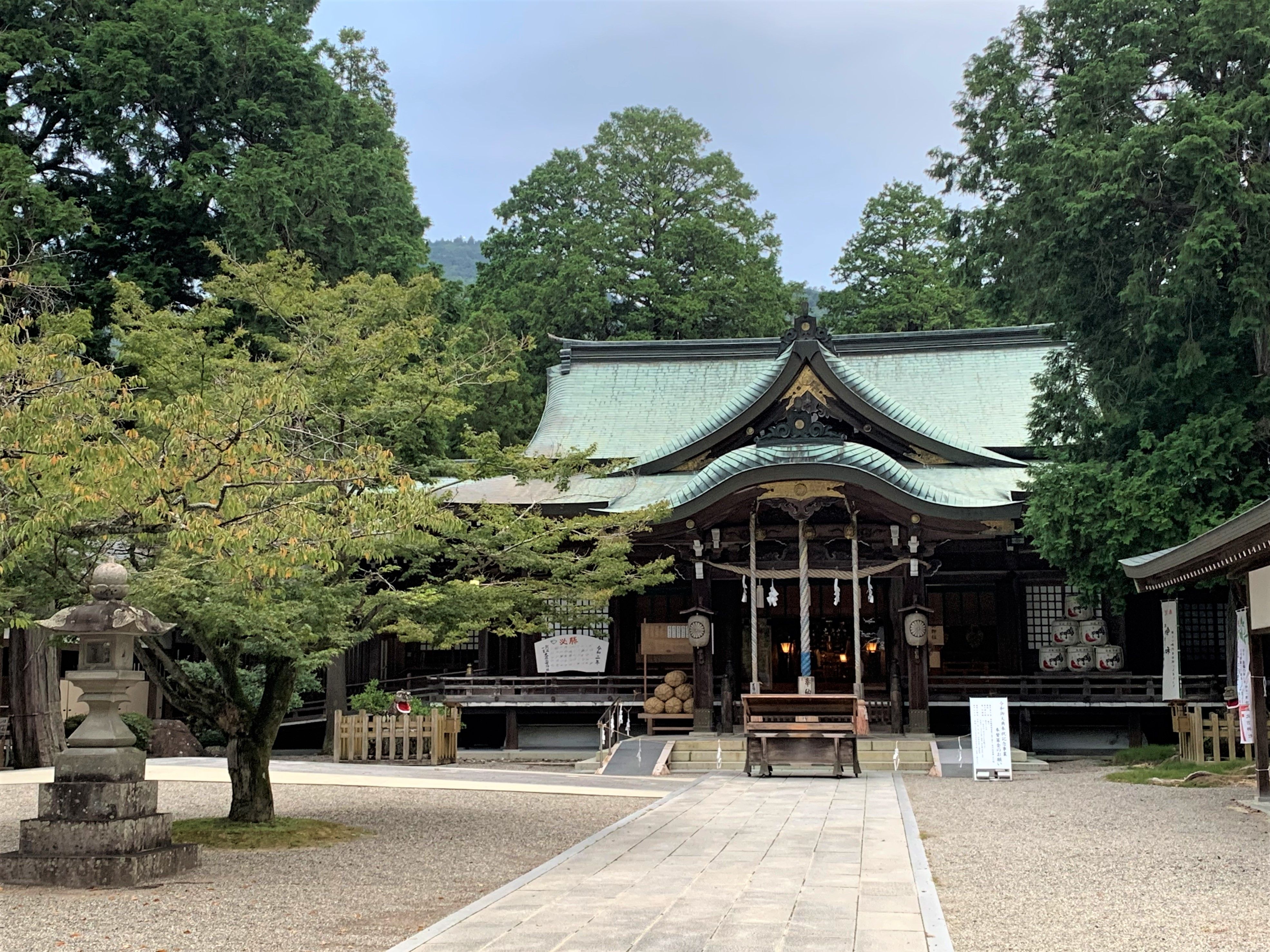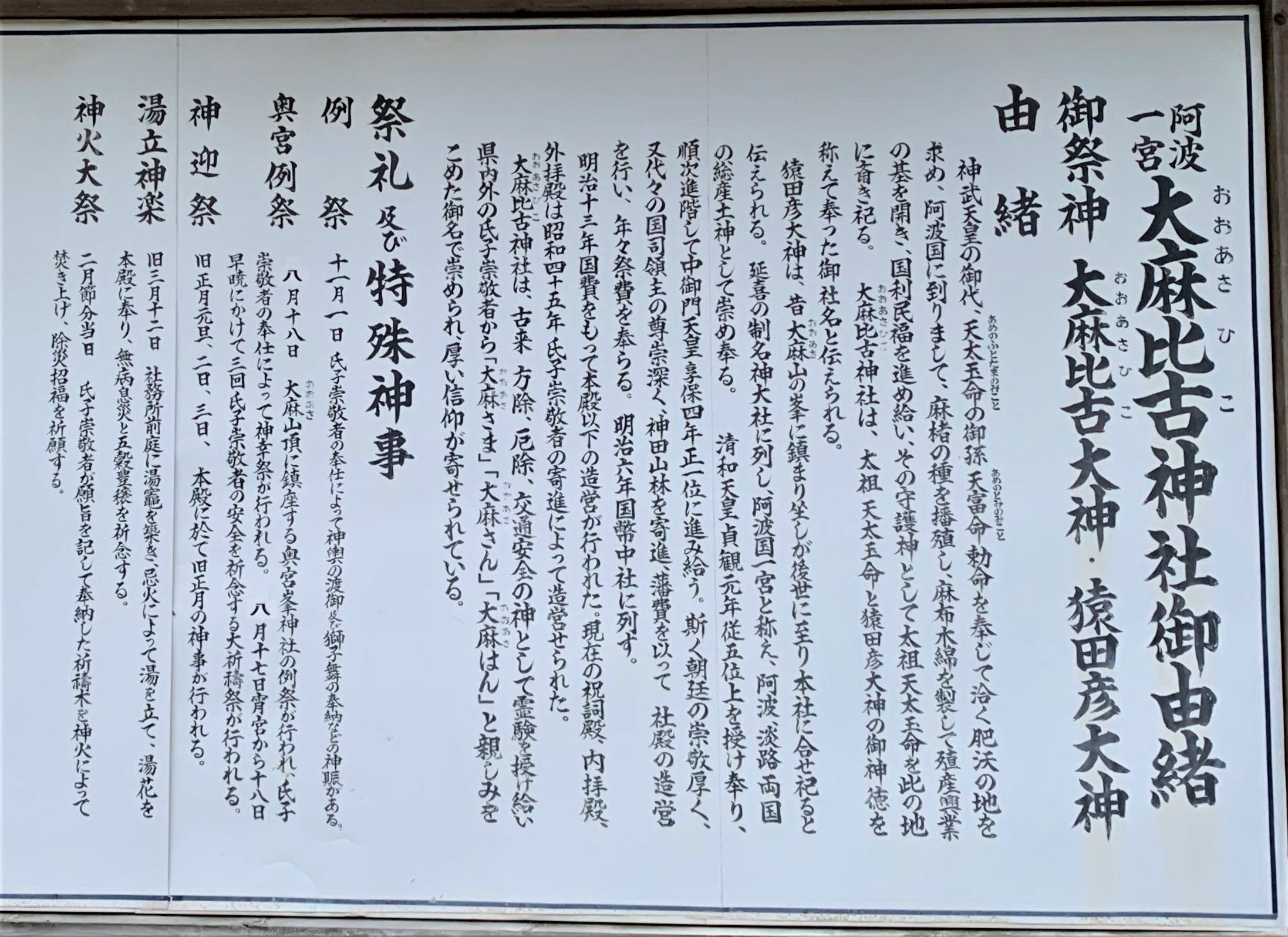 当社の主祭神は、下方の由緒を映した画像に「大麻比古大神」とあるが、古伝によると阿波国(徳島県)を開拓した阿波忌部氏の祖「天日鷲命」の大先祖となる「天太玉命」と異名同神とされる。