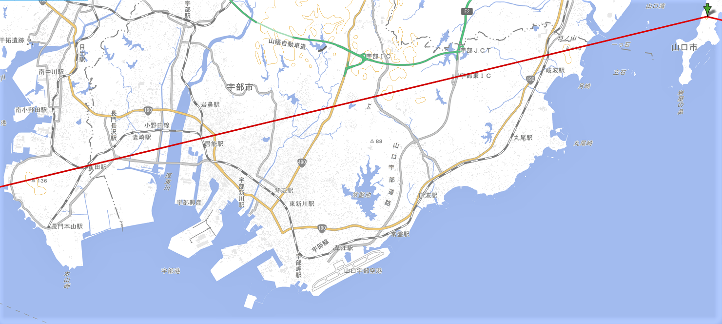この本日(10月23日)の当山山頂(画像右上にある緑色の矢印)から見た「日の入」を示す赤線は、「日ノ山」の山頂を経由し、県内最西端では小野田市の「竜王山(標高136m/地図左端の山)に繋がる。