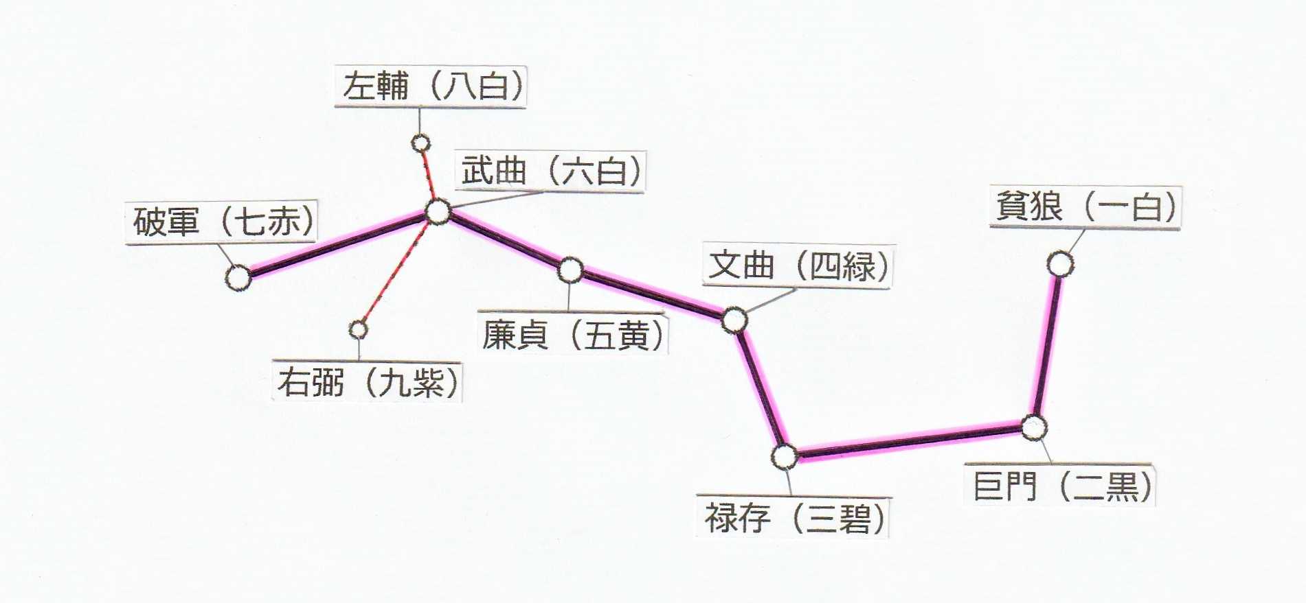 の”シリーズ16編”の続編になるのかも・・・と思いつつ関連情報を集約し、通常は「北斗」とくれば「北斗七星」が想定されるが、その7つの星に「左輔(さほ)」と「右弼(うひつ)」という2つの星(下の画像の”北斗九星図”を参照)を加えた「北斗九星」とされる9つの星々の投影地を、それぞれ現在の東京の地図上に記し赤線で結んだ「北斗図」が上の画像である。