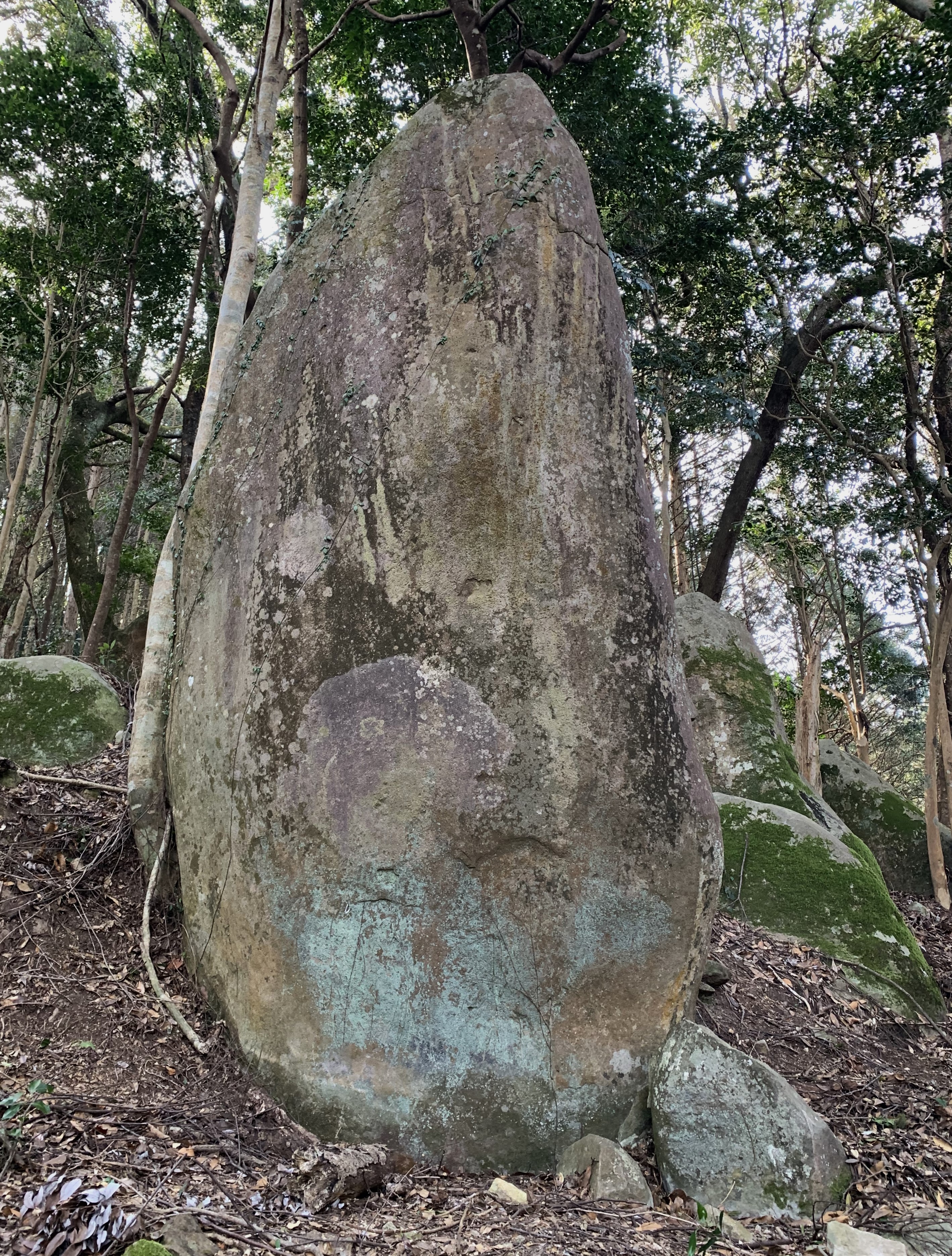 そして上の画像は、上記の「夫婦岩」から左方にかけて鎮座する大岩(左端の尖った磐座)を撮影したものである。