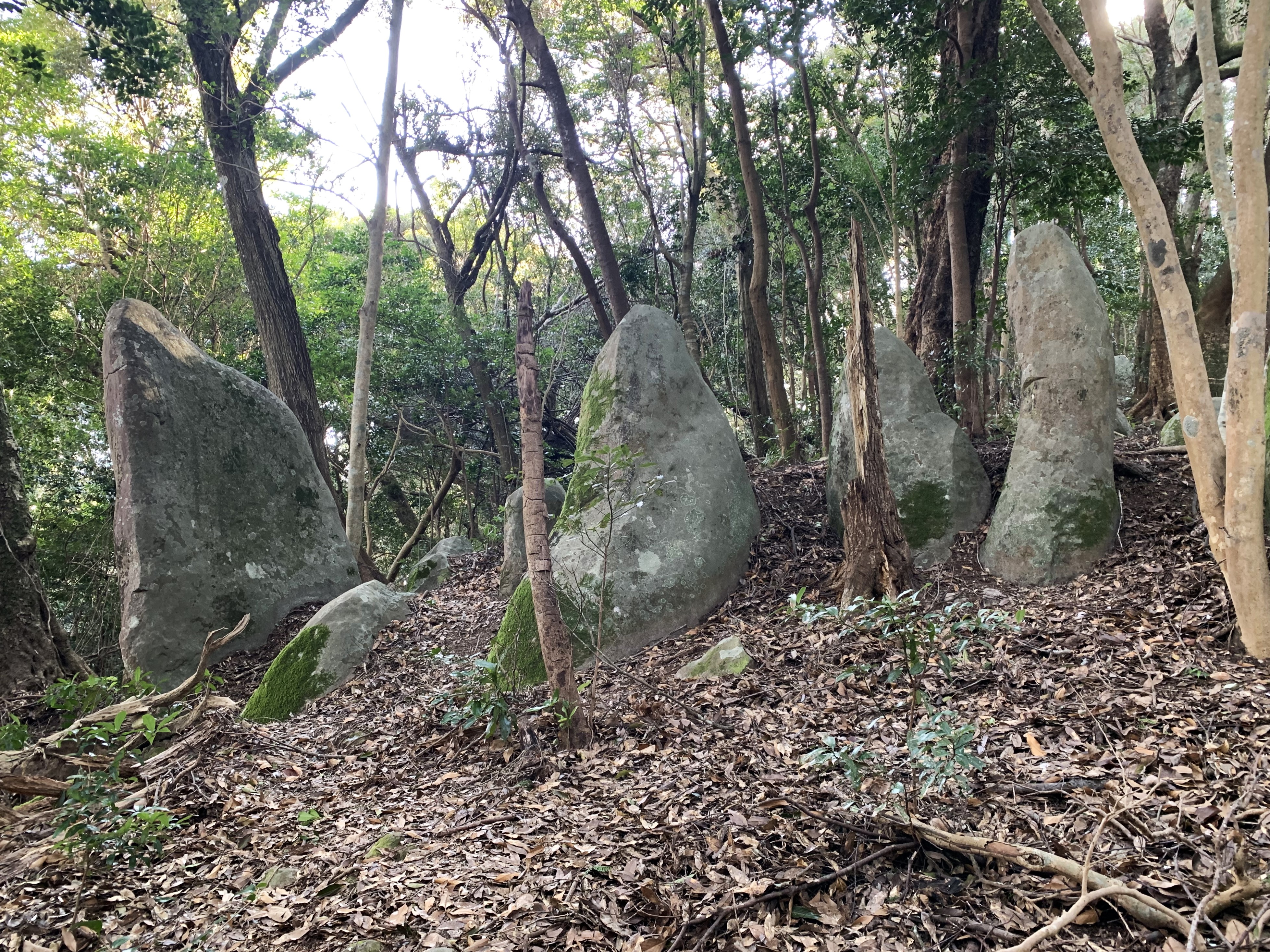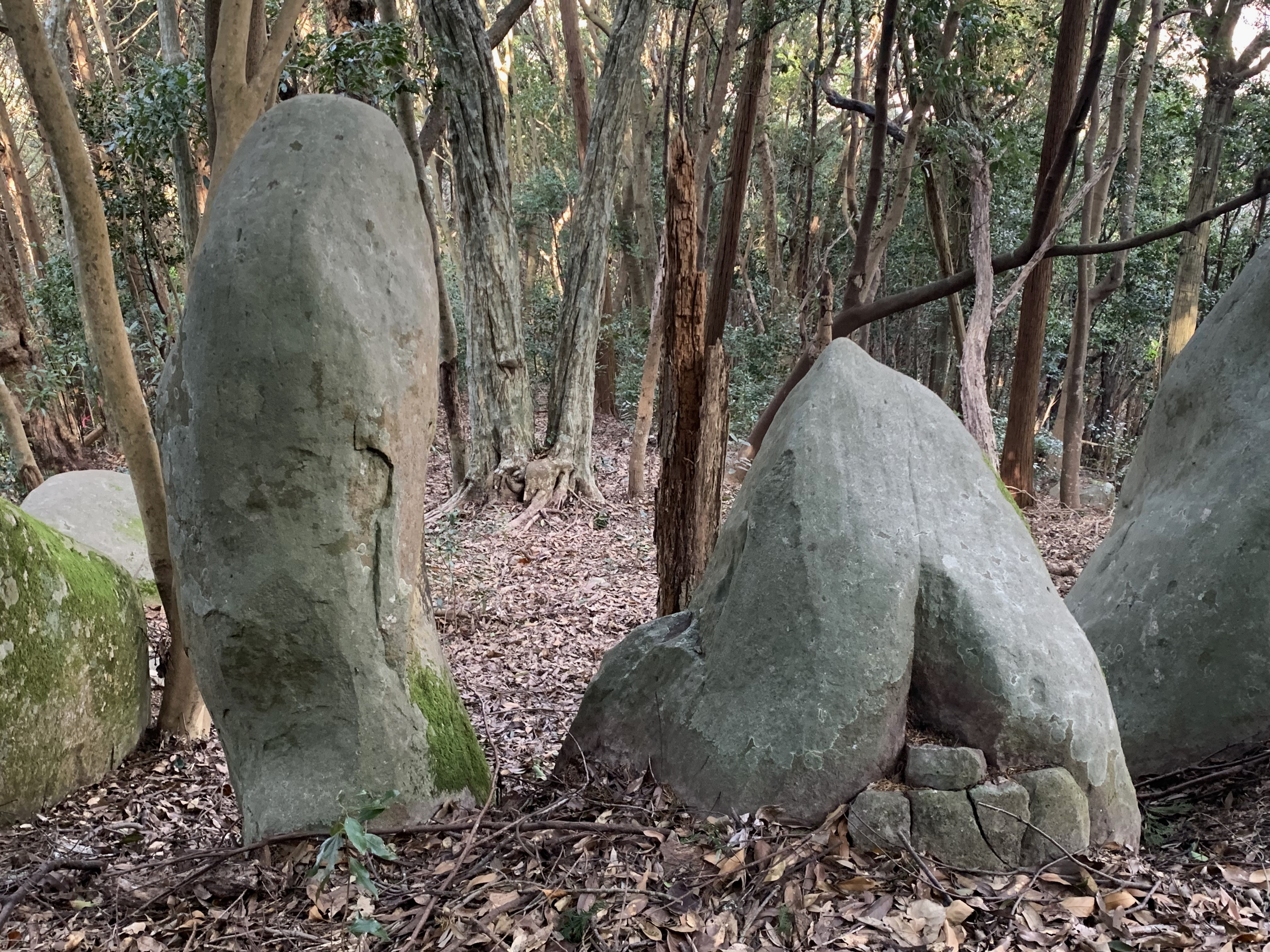 この風情を見た私は、「三日月」(右端に映る男雛の磐座)から「半月(上弦の月)」(左端に映る尖った磐座)に至る、「月」の形状の変化を感得したのであった。
