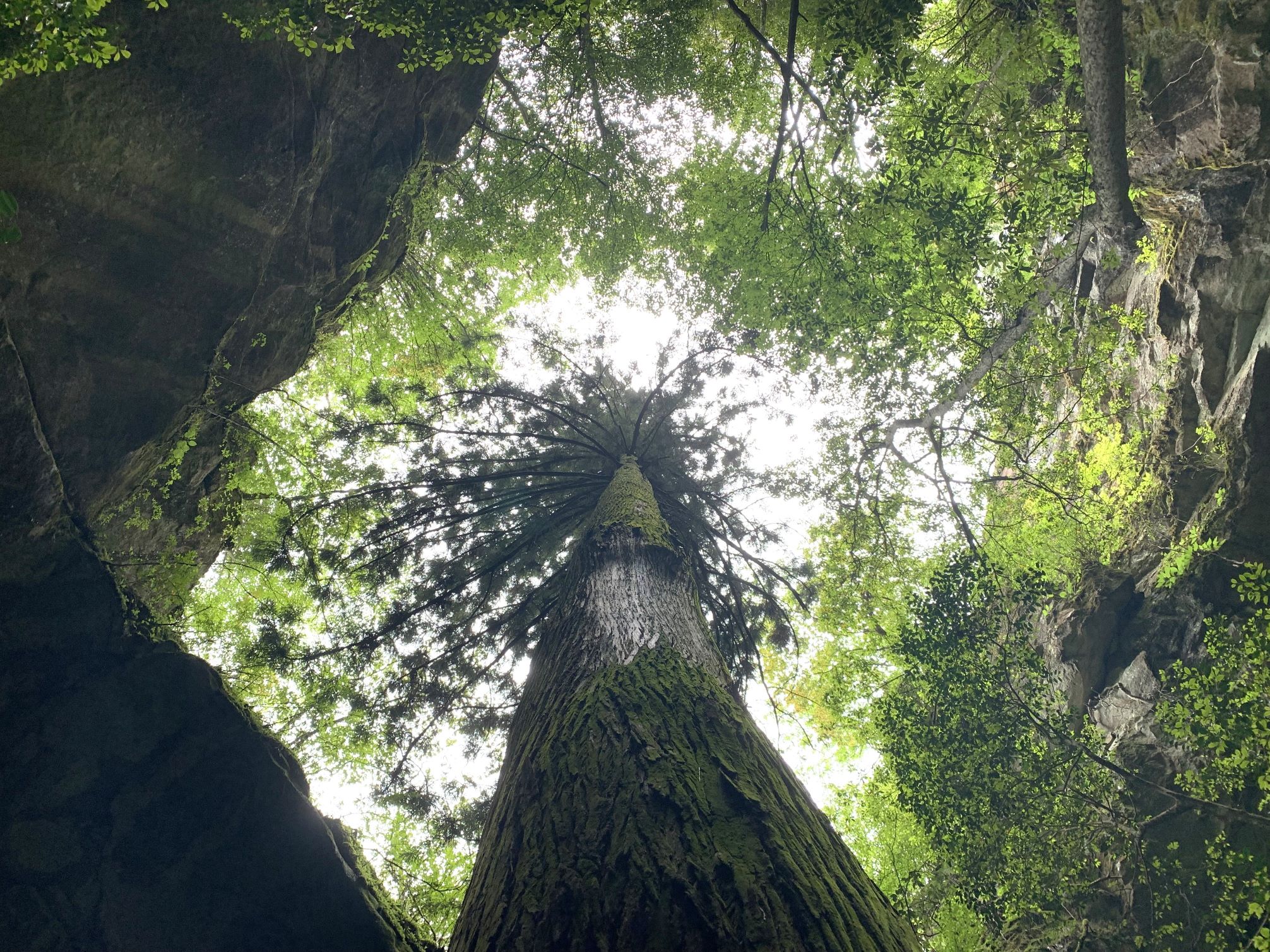 そこで下の画像は、この岩窟の前方に屹立する杉を下方から撮影したもので、画像の右側が行場の岩窟「豊前坊」の方面、そして左側が天然橋の「西京橋」の方面が映っている。