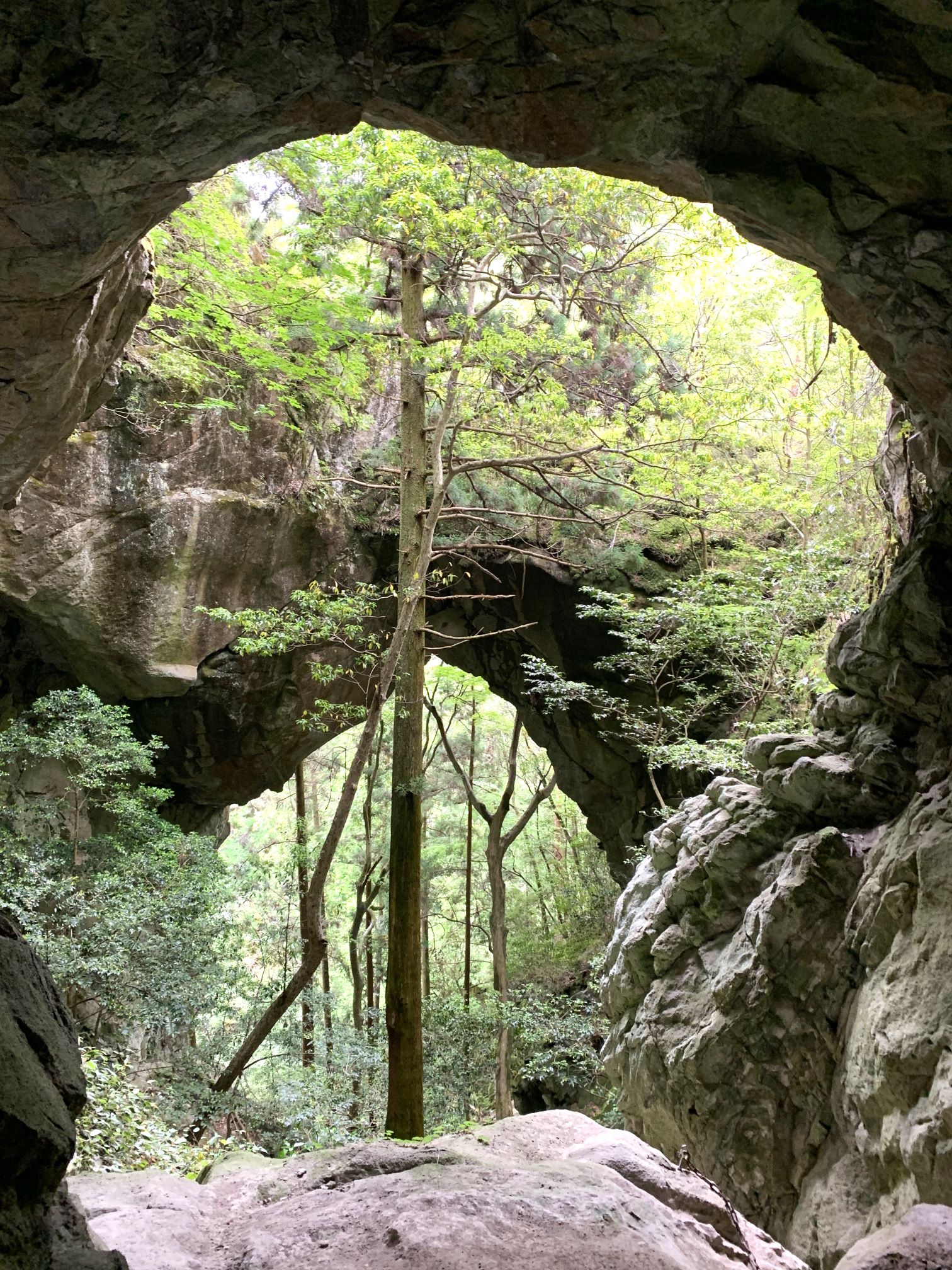 まず上の画像は、前方奥の岩窟(豊前坊)に向かう出入口と感じられた景観を撮影したものだ。