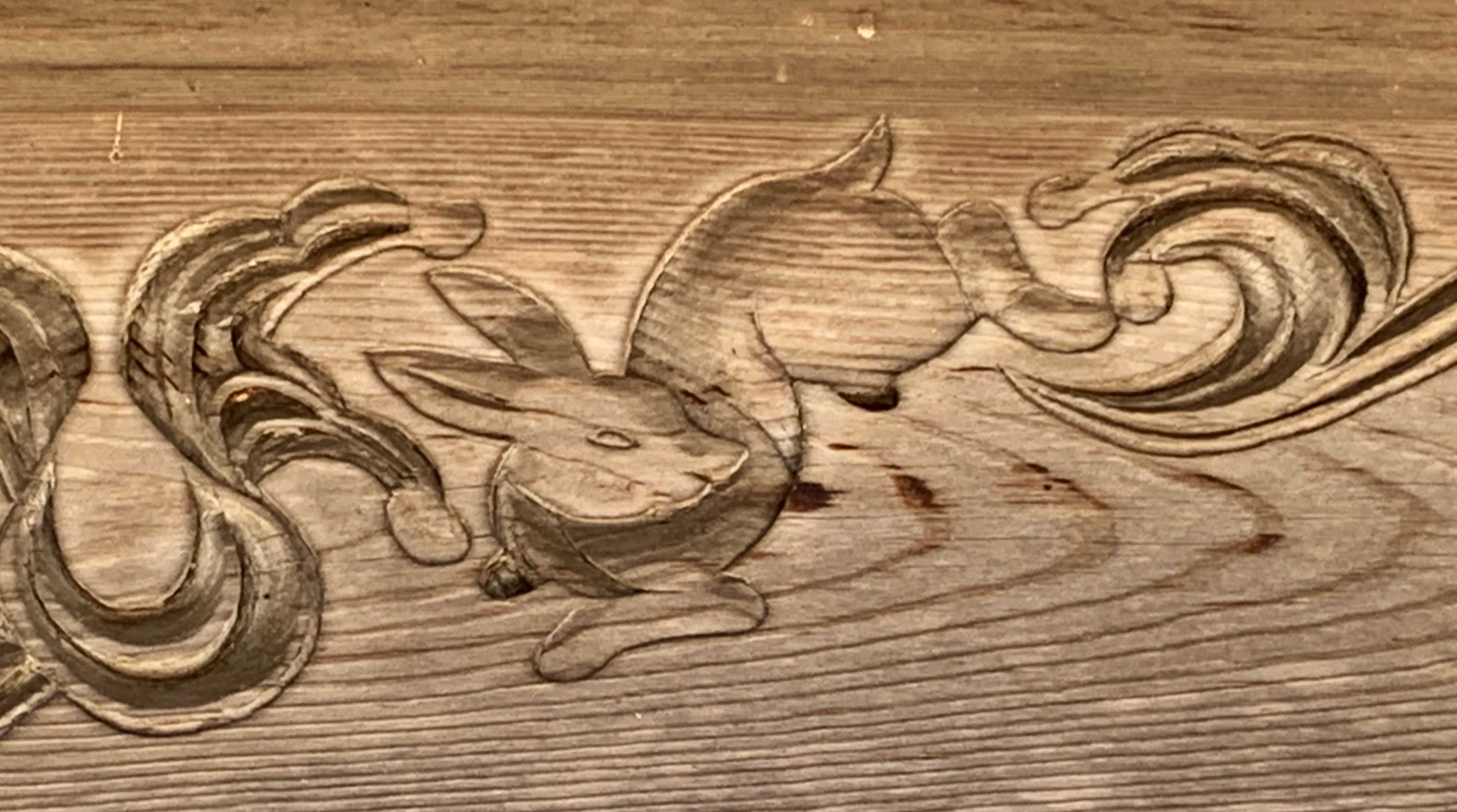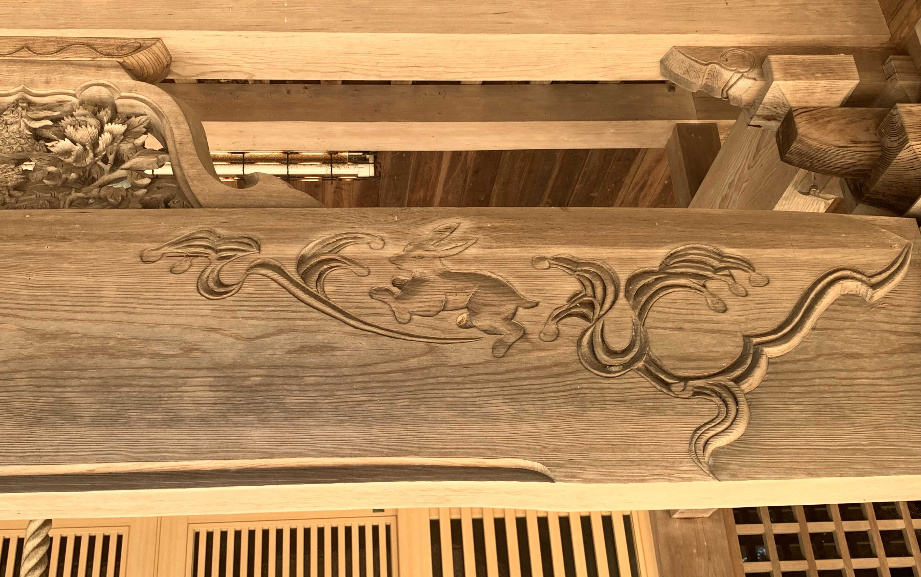 そこで注目してもらいたいのは、社殿向拝の梁に施された彫物(意匠)である。その左右の二ヶ所に対称的に彫刻された意匠は「兎(ウサギ)」であり、その左右に施された「兎」の彫刻を拡大して掲載したものが、この下に続く二枚の画像だ。