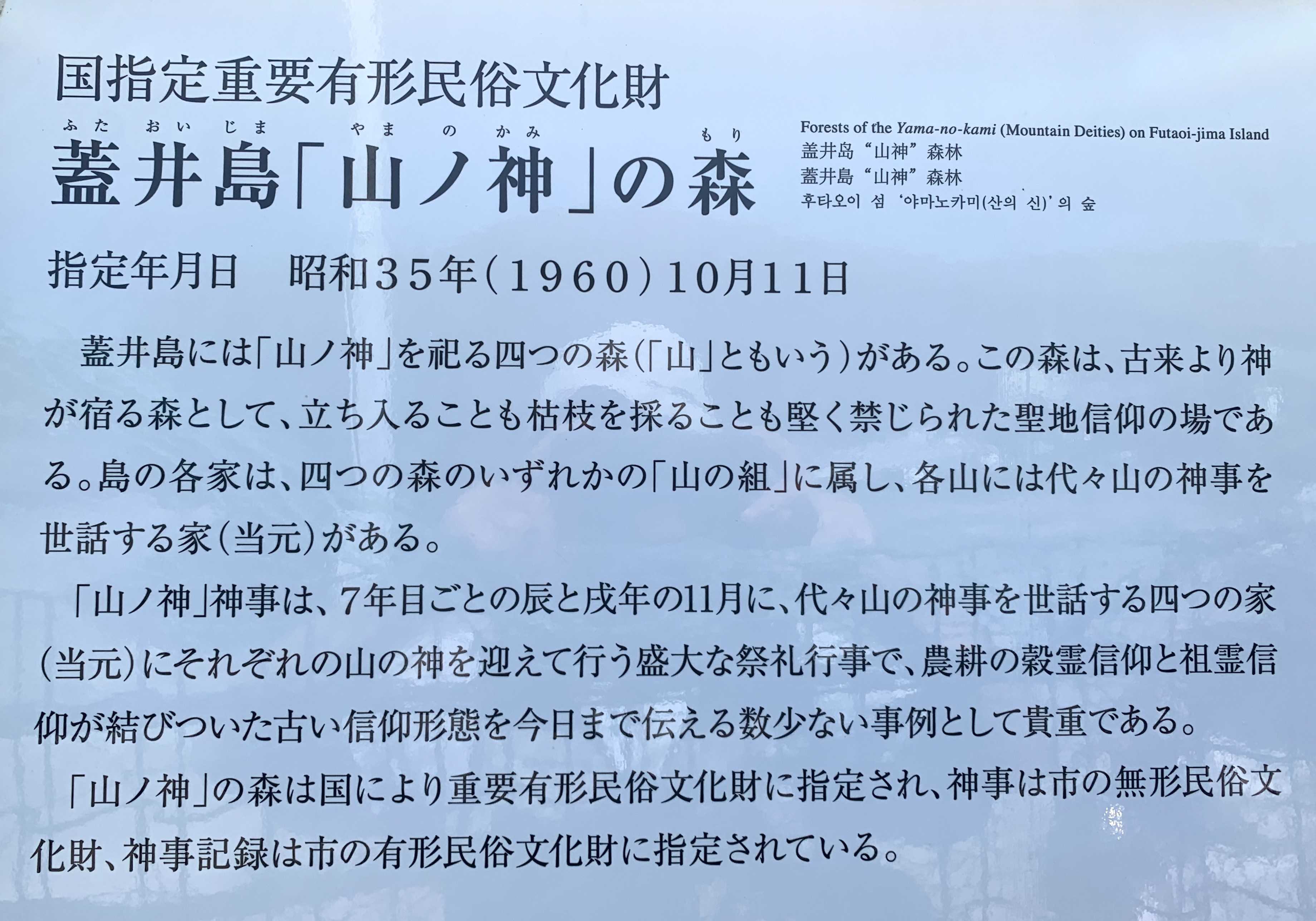 そこで上の画像は、蓋井島の港に下船してすぐの辻に掲載されていた「国指定重要文化財」に関する解説版を撮影したものだ。