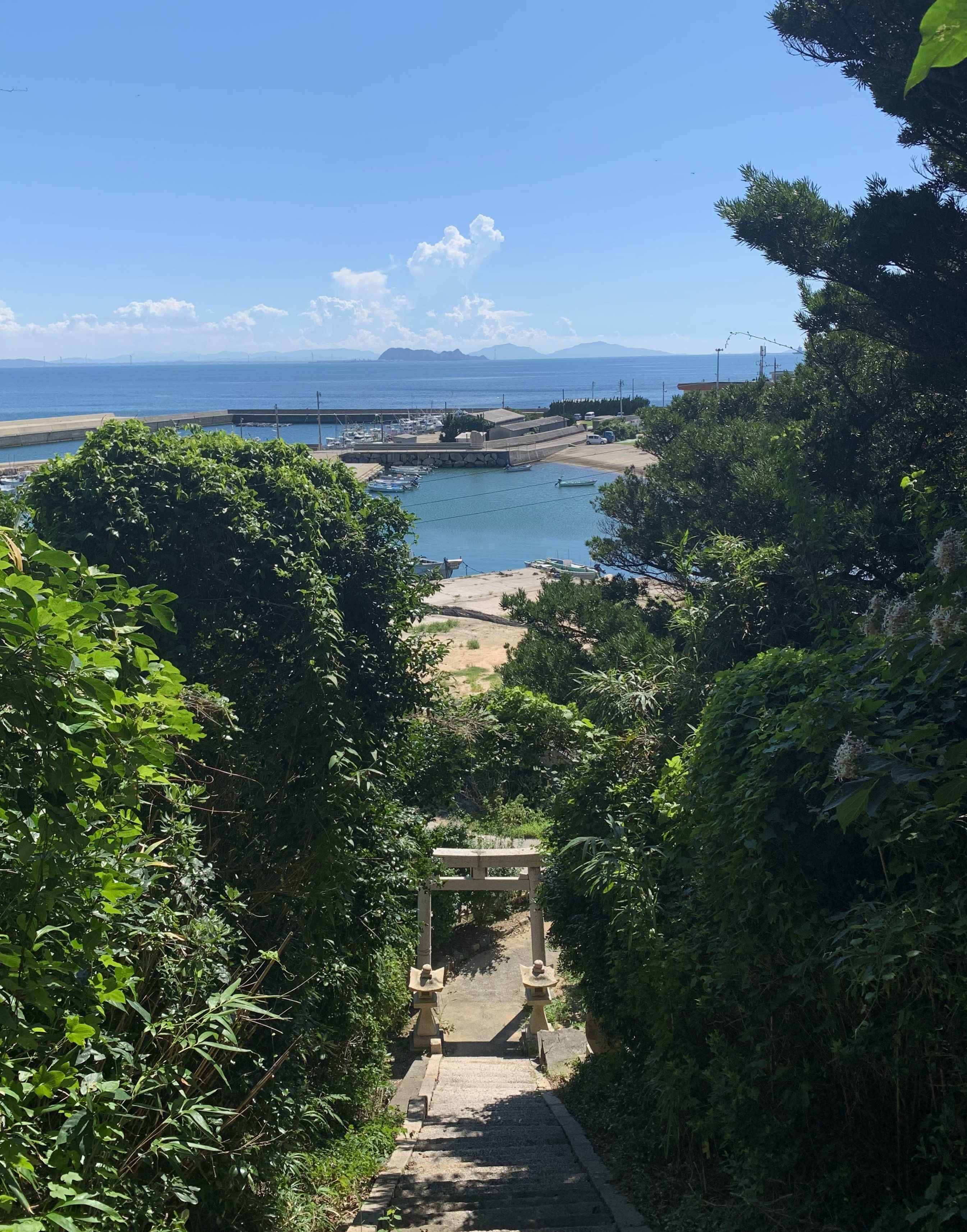 蓋井島の港に近い高台に鎮座する八幡宮の参道から、真っすぐの石段を通して遠望した画像が上である。
